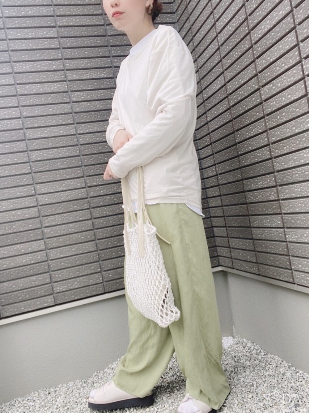 おはようございます☀ シアートップス➕Tシャツ👚✨ ピスタチオパンツ👖 ほんのりペイズリー柄😊💕 👚👖//GW 厚底サンダル👡でちょっと 背が伸びた気分。。🤗✳︎