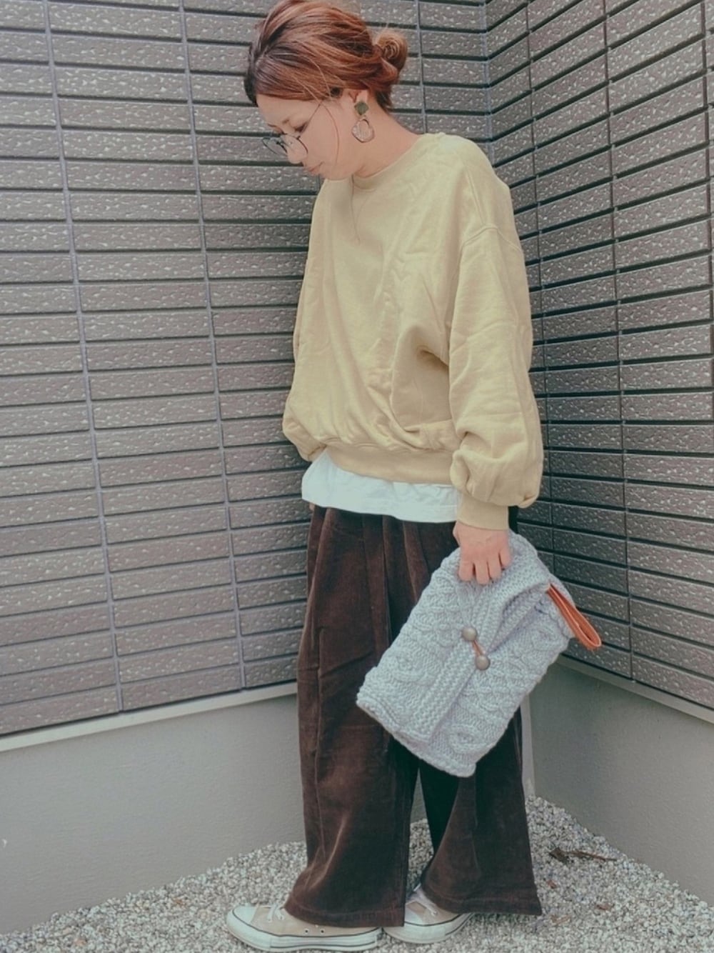 おはようございます☀ イエロー💛✖️ブラウン🤎 guのニットクラッチは 結構前のやけどこの時期になると 絶対使いたくなるお気に入り😃💖