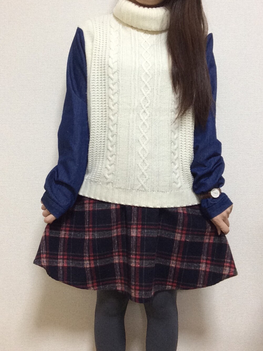 kbfのニット、お気に入りすぎて絶賛ヘビロテ中〜*\(^o^)/* 今日はチェック柄スカートと合わせてみたけど、、ガーリーになりすぎたなぁ。と反省( ;∀;)