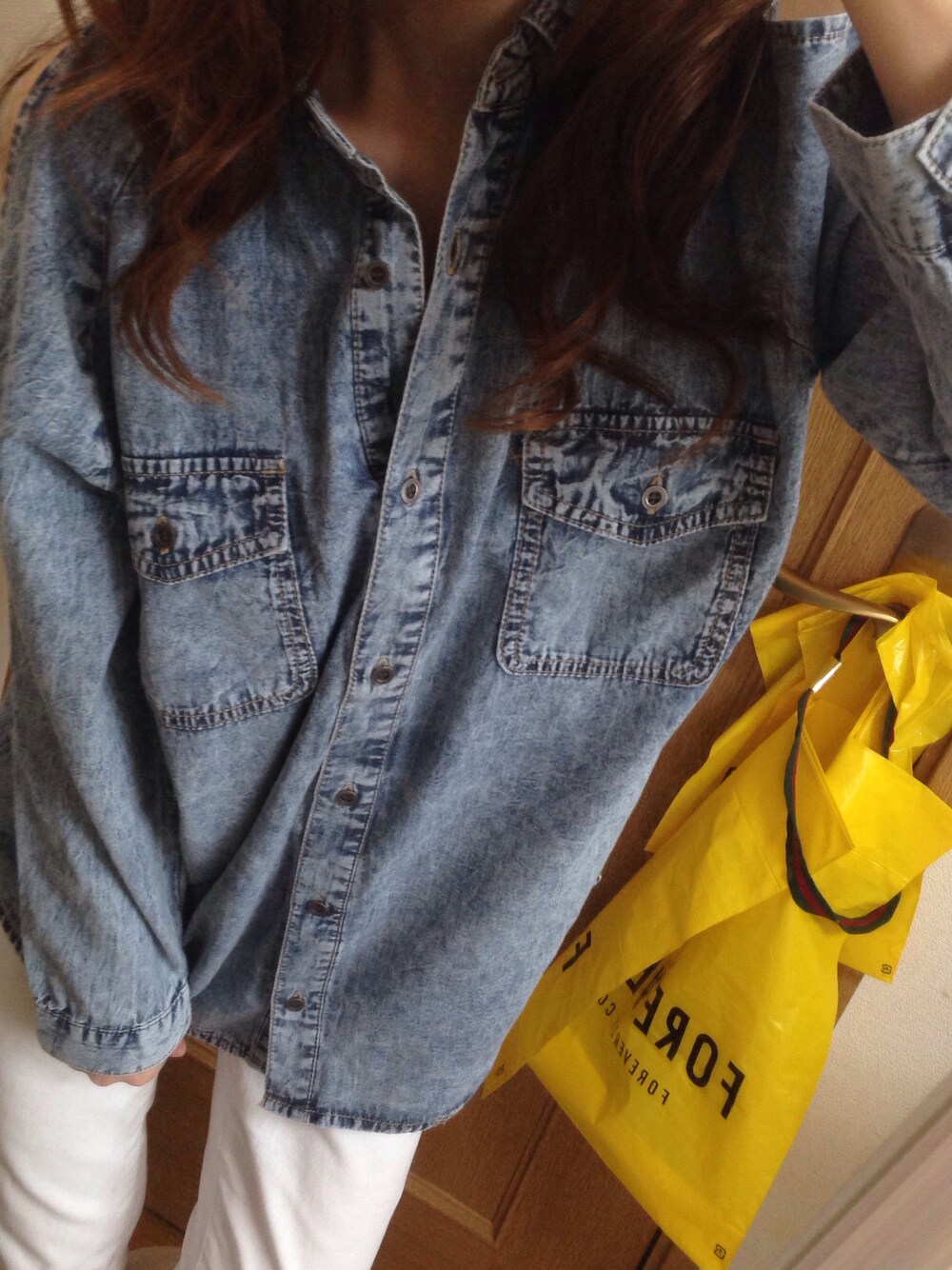 トップス:ケミカルデニムシャツ パンツ:ホワイトデニム シューズ:LEPSIMスニーカー