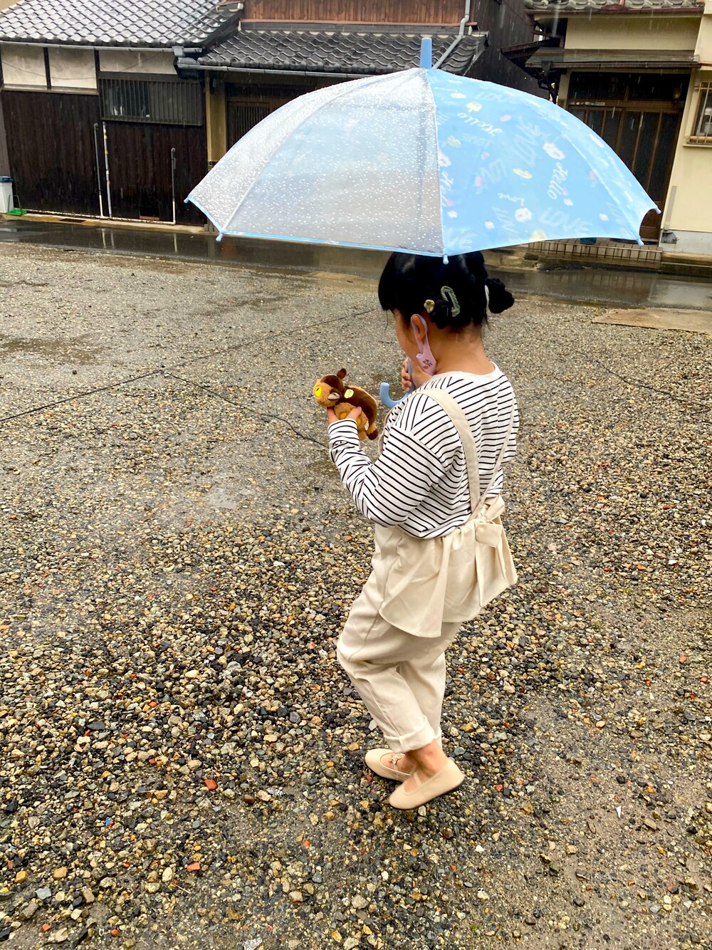 雨だねー☔️ 大好きなネコバス人形と◎ まだまだお人形大好きね。