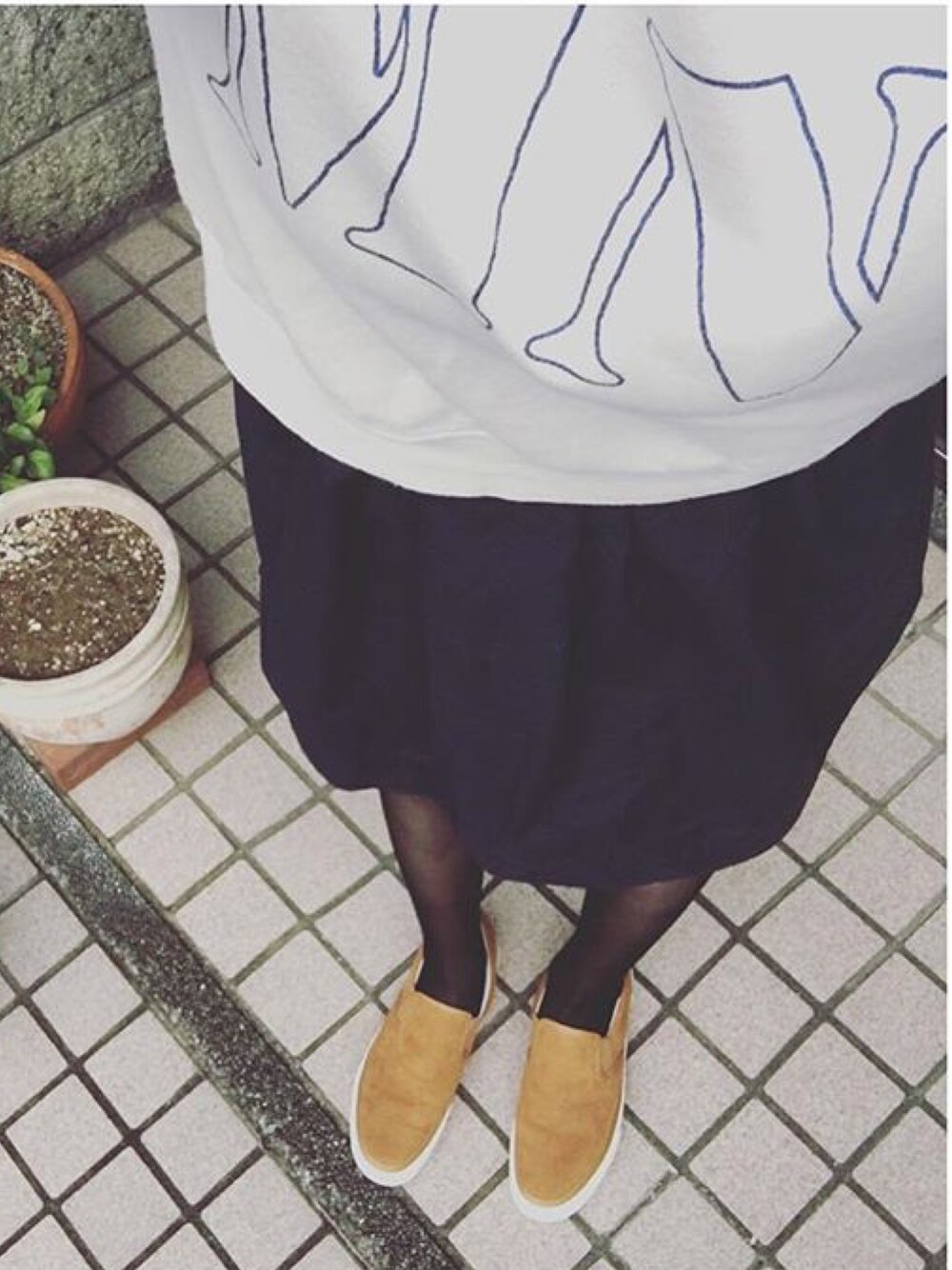 スカートにタイツとスリッポンを合わせるのも好きです👟 ガーリーになり過ぎない感じが○ スエットは楽チンですね。(^^)