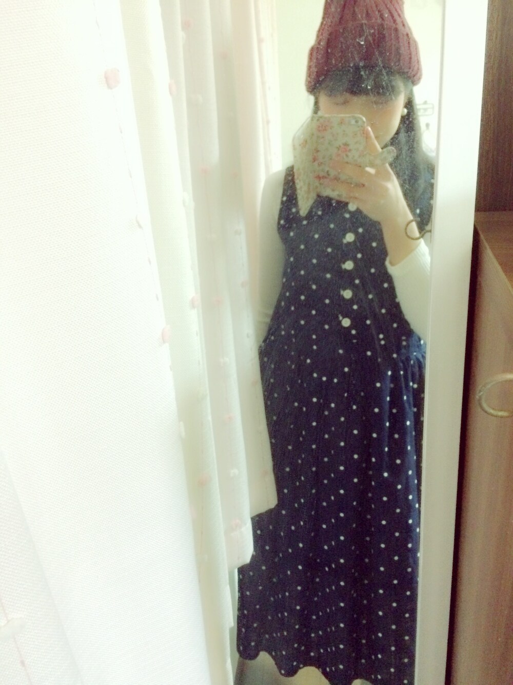 水 玉 ワ ン ピ ー ス と 白 タ ー ト ル 。 赤 の ニ ッ ト 帽 あ わ せ て 。