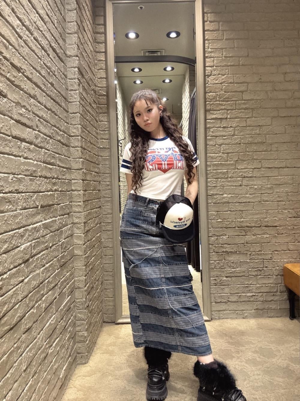 cocoa0821(HYSTERIC GLAMOURアミュプラザ博多店)のスカート「スクラッチロングデニムスカート」を使ったコーディネート
