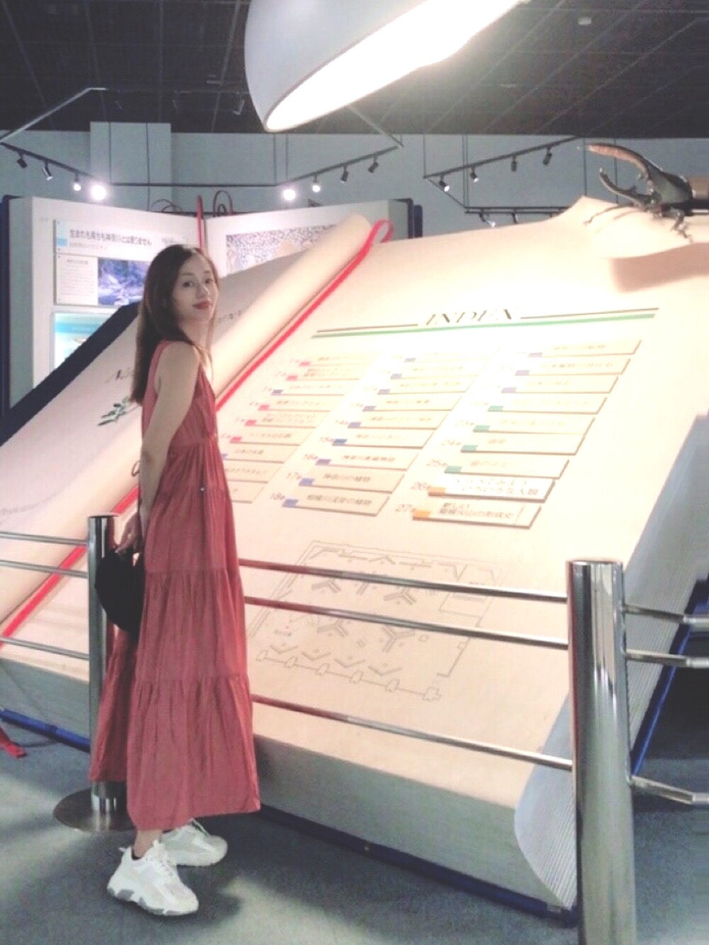 ホワイト系のスニーカー、オレンジ系のワンピースを着用したレディースの夏コーディネートの1枚目の写真