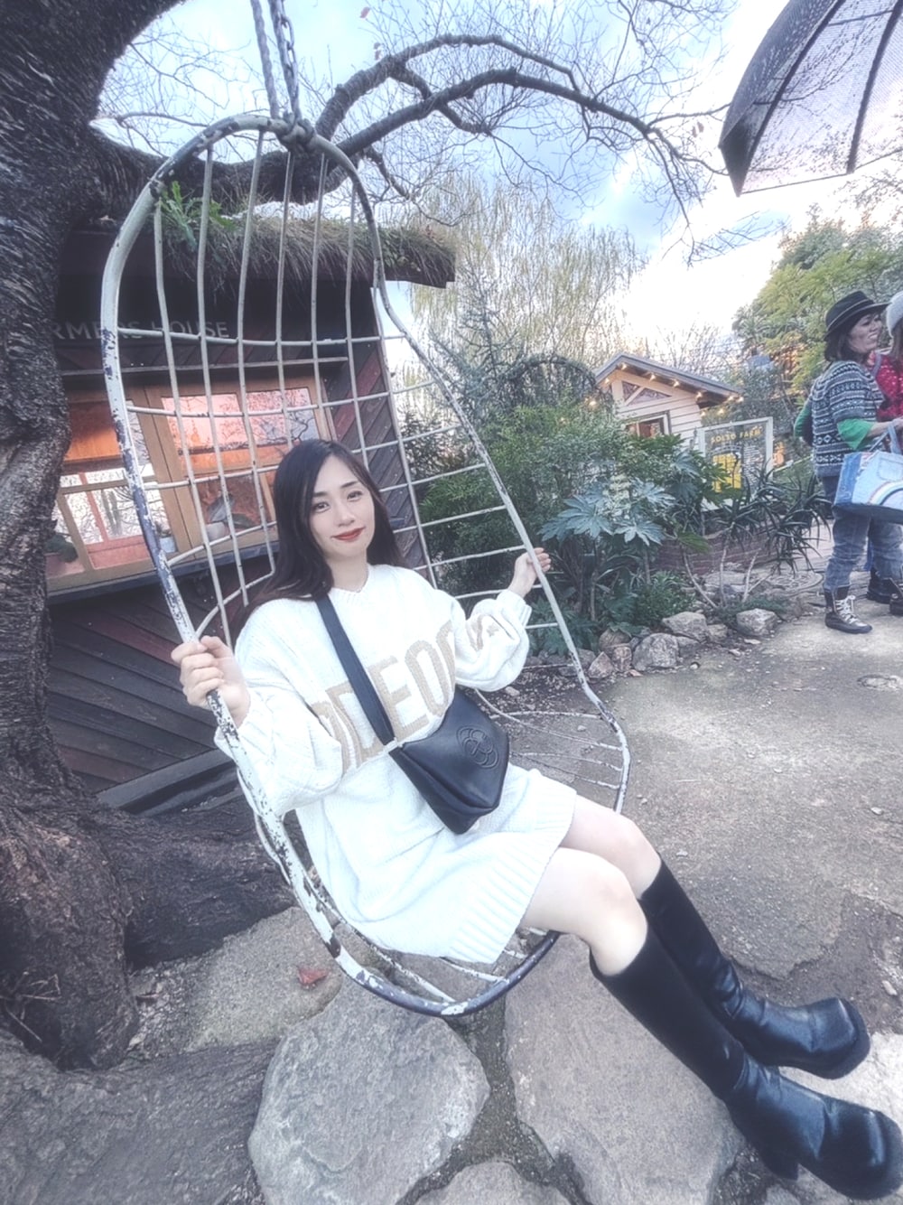 ホワイト系のニット/セーターを着用したレディースの冬コーディネートの1枚目の写真