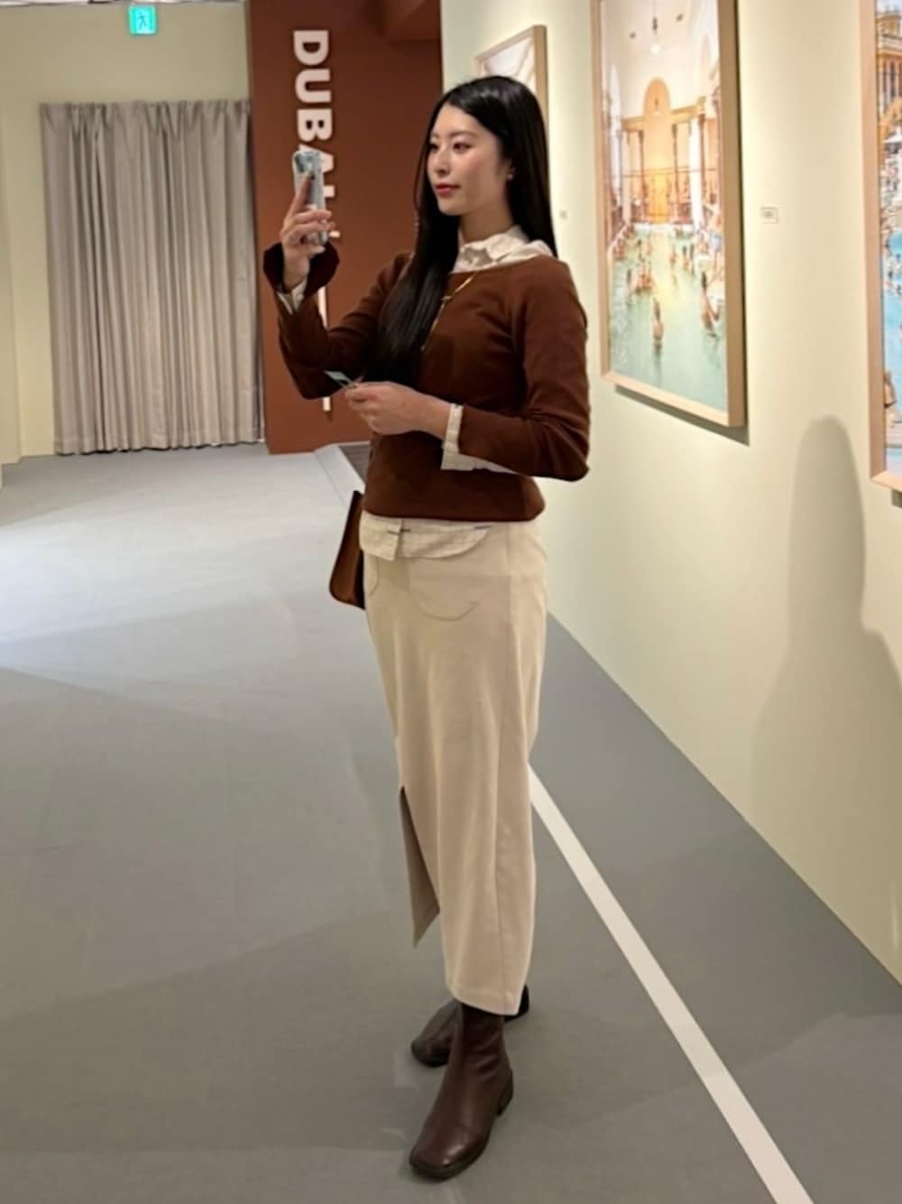 寒くなったのでオフショルニットにシャツインして着回し🍂 YOSHIGOの展示会最高におしゃれでした🏊🩵🤍