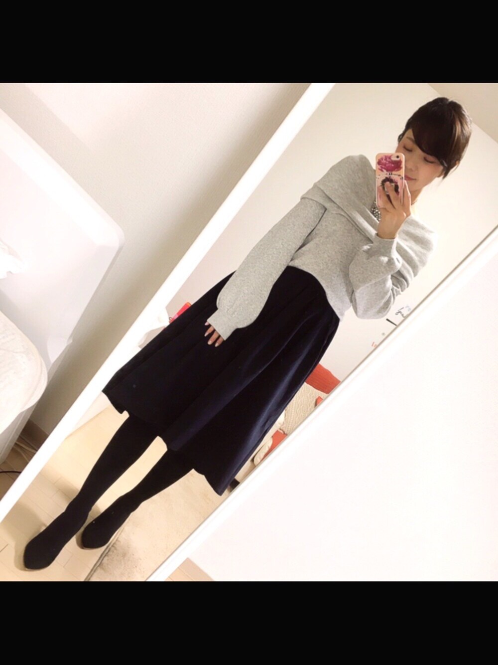 たまにはスカート♪ これじゃわかんないけど本当はスカートの後ろが前より長くなってます♪ ニットはオフショルで袖がほわ〜んと太めになってて今年っぽい。分厚めなニットをスカートにインするからウエストがちょっと苦しい…笑