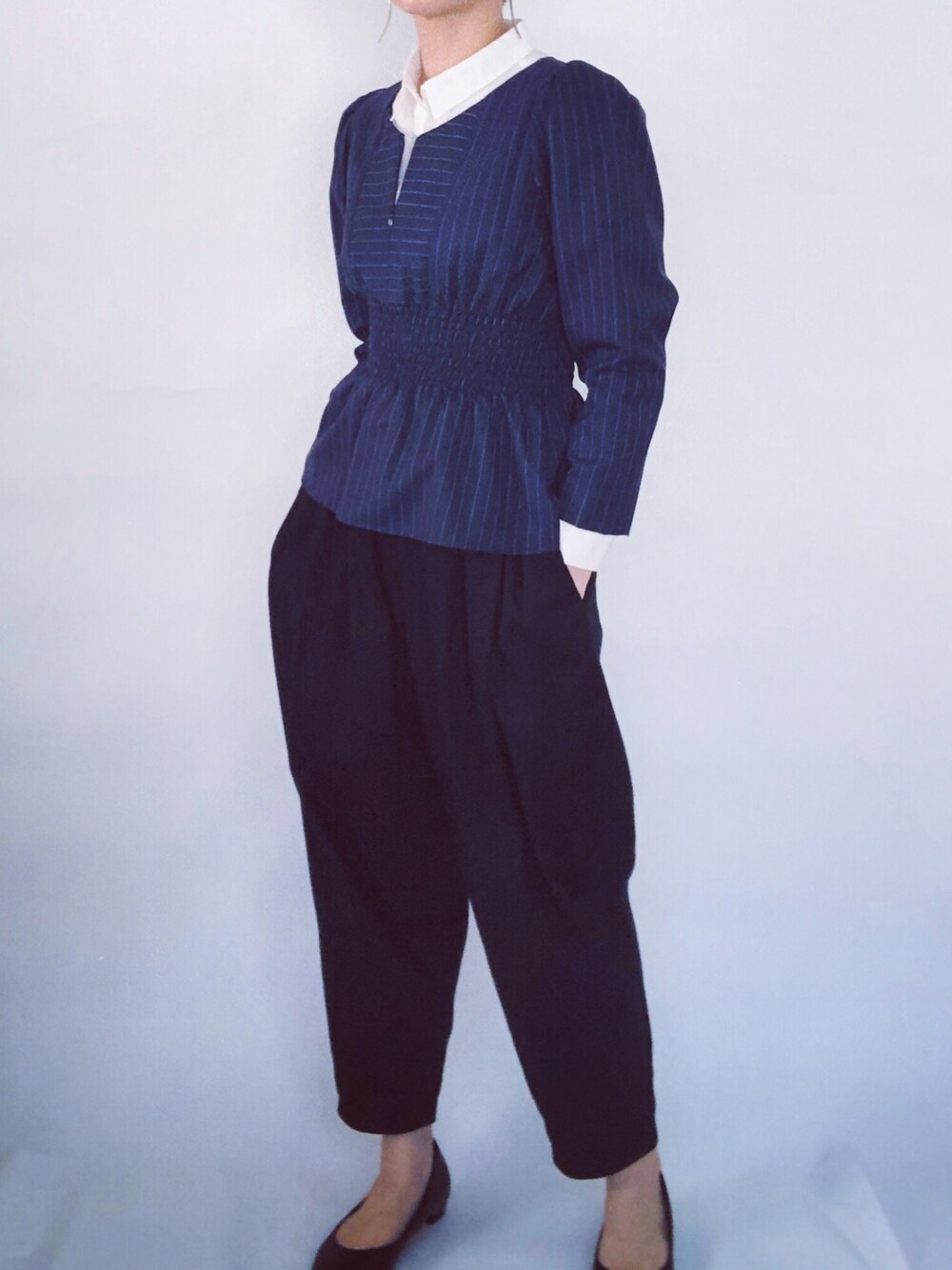 メンズライクなストライプ生地にウエストギャザーデザインのプルオーバー