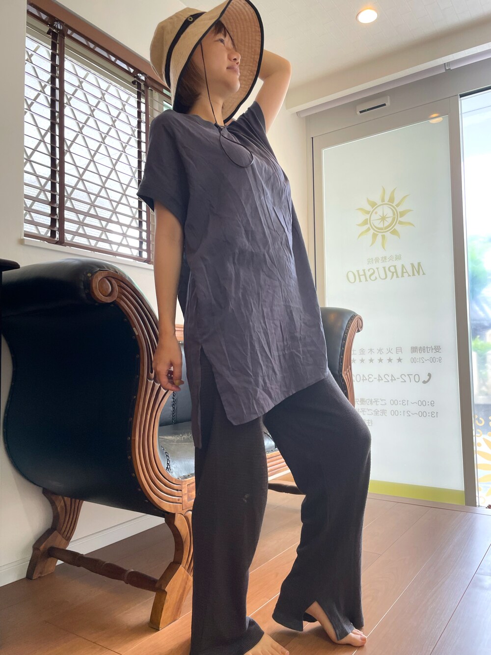 帽子👒は紐付きだから自転車や風で飛んで行かないし、つばも広めだから夏めっちゃ使える👍 チュニックTは生地が薄くて暑い日にピッタリ👍 着やすくていい感じ👍