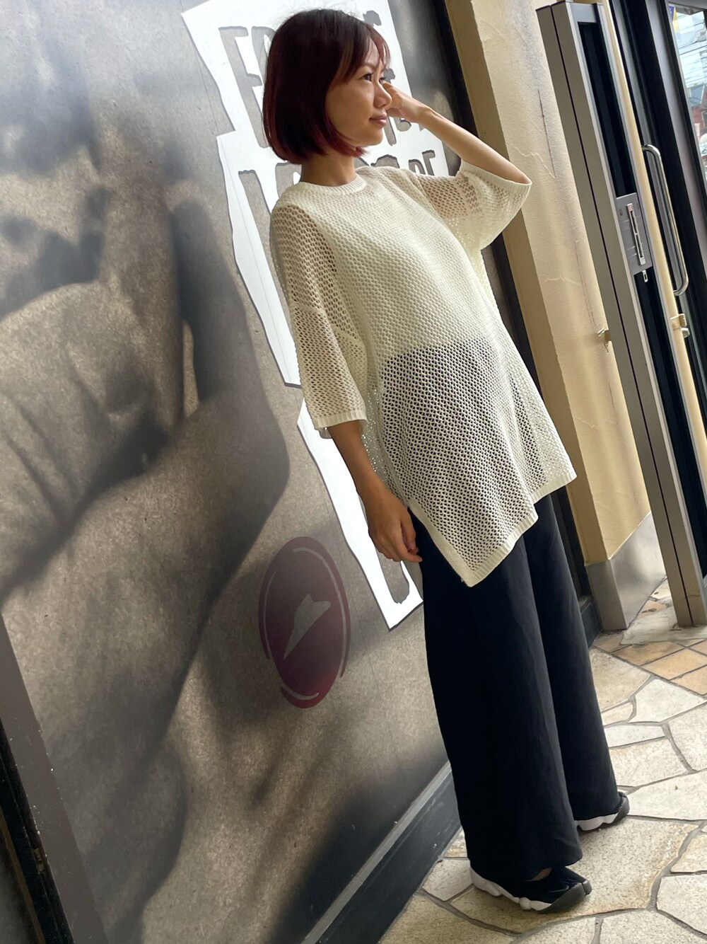 メッシュの半袖ニットは今の季節にちょーど使えてめっちゃ気に入ってます❤️ 中はキャミでもタンクトップでも合わせやすいから買って良かった🥹 黒のパンツも涼しい生地感で履き心地抜群👍 初夏コーデにはぴったり❤️