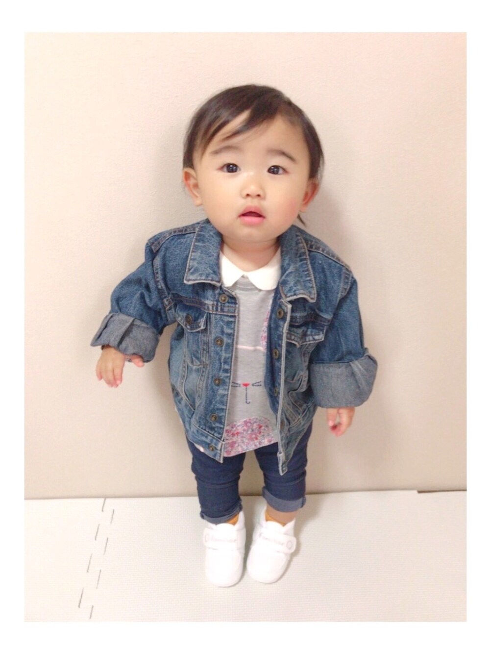 デニム×デニムコーデ 寒いので中に襟付きトップスをいれて グレーのスェットで合わせました🙋❤️ デニムのアウターもオーバーサイズ やから形がすごいかわいくて お気に入りのコーディネートです❤️❤️