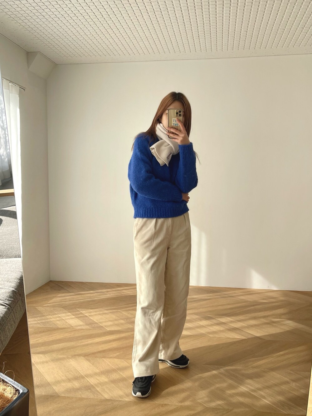 ブルー×ホワイトコーデ🫐 深めのブルーと毛足の長い素材感が上品に大人っぽく見せてくれるニット パンツはワイドシルエットだけどタックが入ってるからスッキリしたシルエットに◎