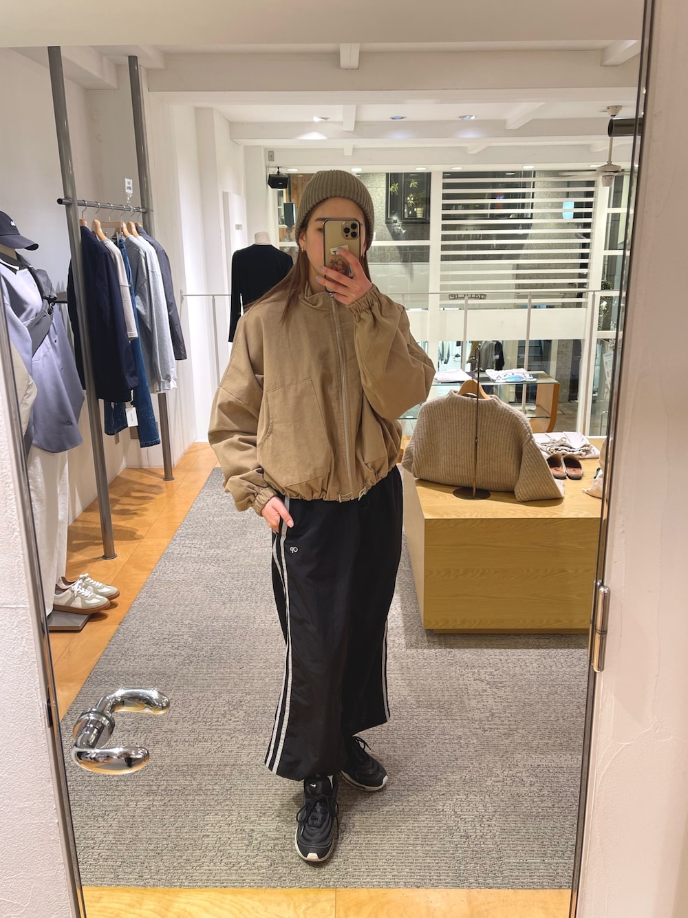スタンドカラーなのと、丸いシルエットが可愛いアウター◎ コンパクトで裾が絞れるアウターがトレンド感あって好き サイドラインがスポーティだけどスカートなので女性らしさをプラスしてくれるアイテム インナーは去年から愛用してるコンパクトトレーナー