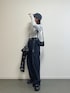 グレー系のトップス、ブラック系のデニムパンツを着用したレディースの秋コーディネートの2枚目の写真