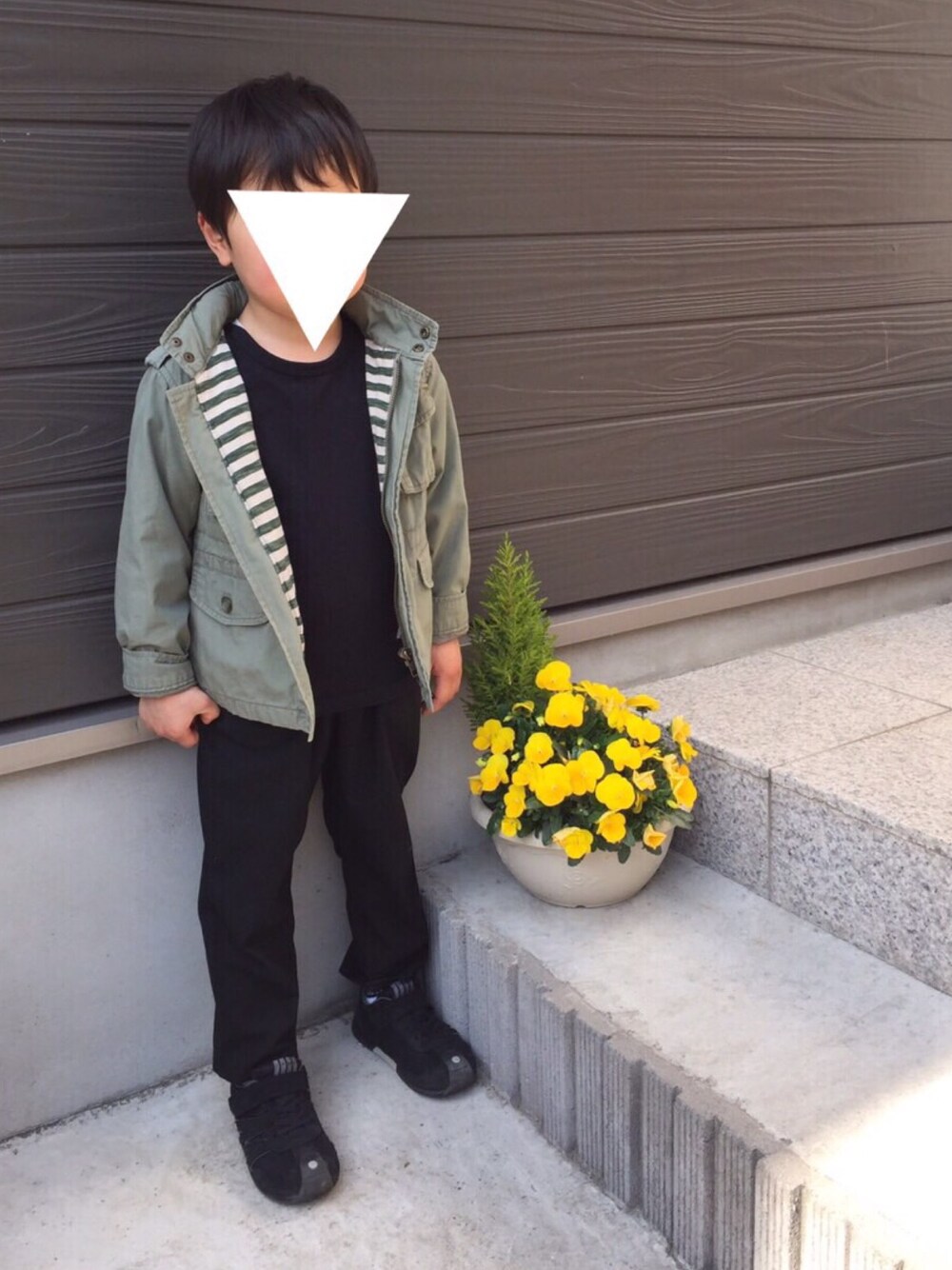 自分のコーデがマンネリ気味なので、息子のコーデを💡 古着屋で300円で購入した、ミリタリージャケットで春らしさを出しつつ、インナー、パンツ、シューズを黒に統一することで、男らしい印象にしました(°▽°) 最近、自転車の練習を頑張ってます🚲