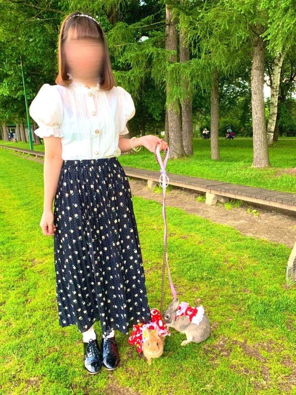 おはようございます☀️ ご覧いただきありがとうございます😊😊 全身アプレジュールコーデです👚 この組み合わせ気に入ってます😌💭 ブラウスは襟とイロイロボタンがとても可愛い☺️ よーく見たらボタンが色々な種類になってるんですよ👀 今回はコーディネートだけではなく うさぎさんとも一緒に📷🐰 実はうさぎが大好きなんです🐰💕 2匹飼っています🐰🐰 この日は天気が良い日だったので 公園まで行ってお散歩しました☺️