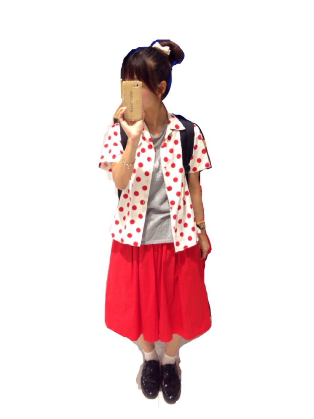 今日は好きな赤で全身コーデしてみました^_^ 最近、赤ドットをaikoがよく着ているので、感化されました☺︎ あまり見えていませんが、ビュルデサボンのブランド、kvellの魚拓Tシャツは、一目惚れで買ったお気に入りの1枚♪ 首のところにさりげなくリボンがついているのがワンポイントです。 可愛いので、表にも自分でリボンを付けました☺︎ この格好で苺のかき氷を食べていたら 「お洋服も苺みたいですね♪」と可愛い店員さんが声をかけてくれました(笑)