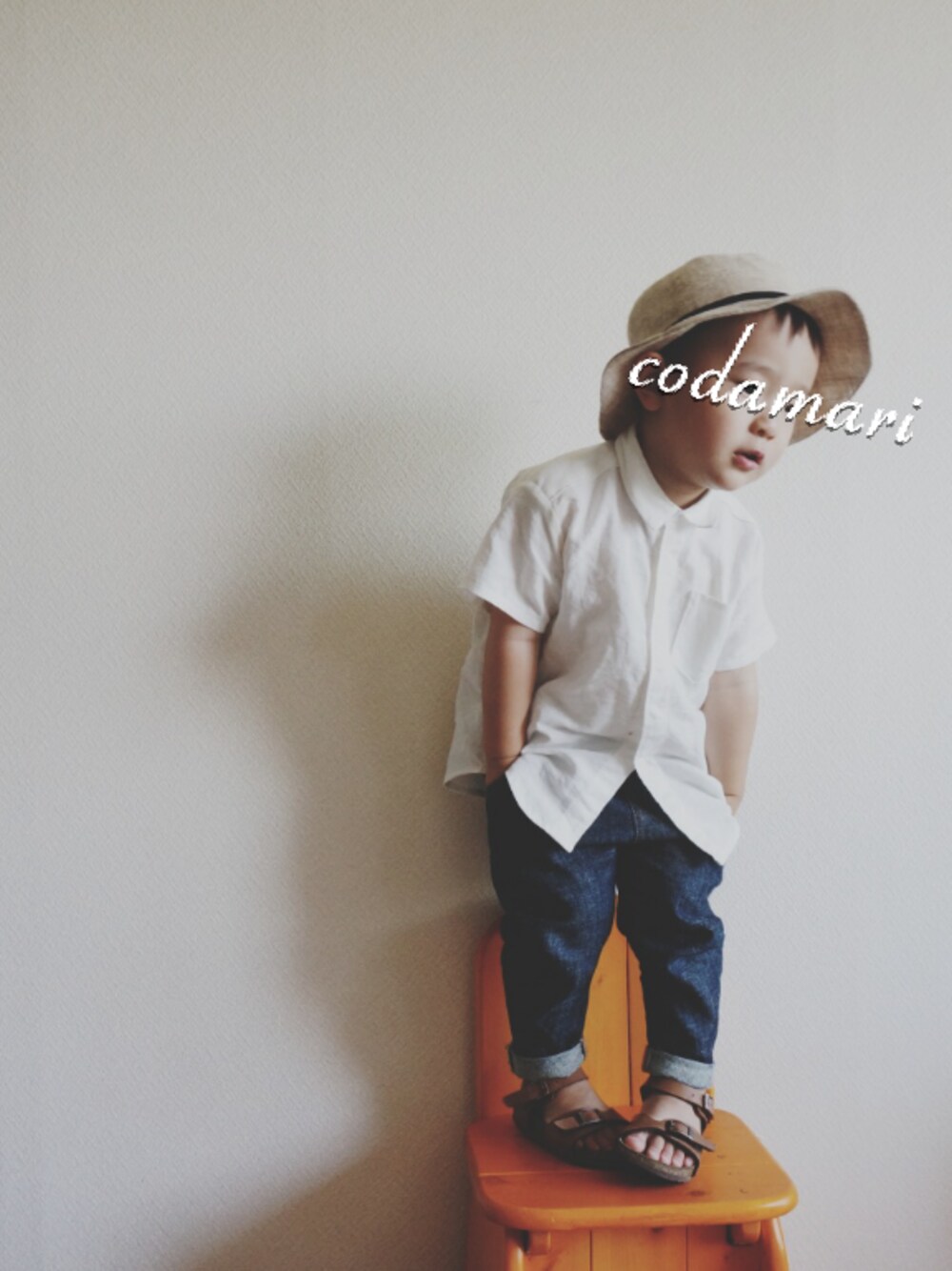 息子に半袖の白シャツを縫いました が、サイズがぴったりすぎました。がびーん でも、やっぱり 白シャツ×デニム 好き