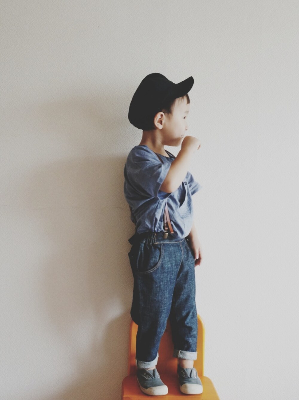 ブルー系のデニムパンツを着用したキッズの夏コーディネートの1枚目の写真