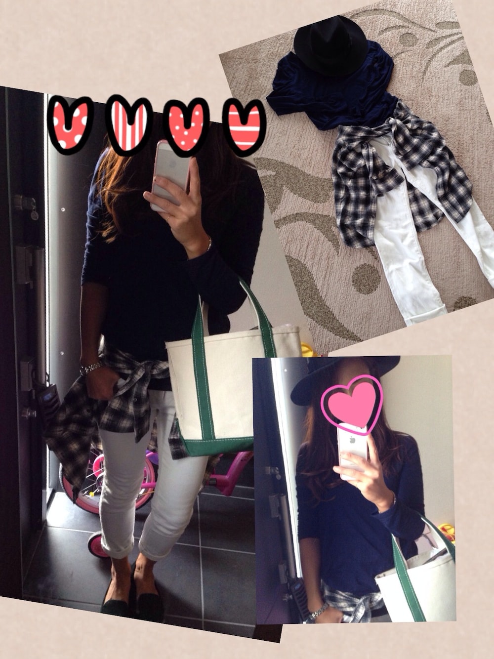 ホワイト系のその他パンツ、ブルー系のTシャツ/カットソーを着用したレディースの秋コーディネートの1枚目の写真