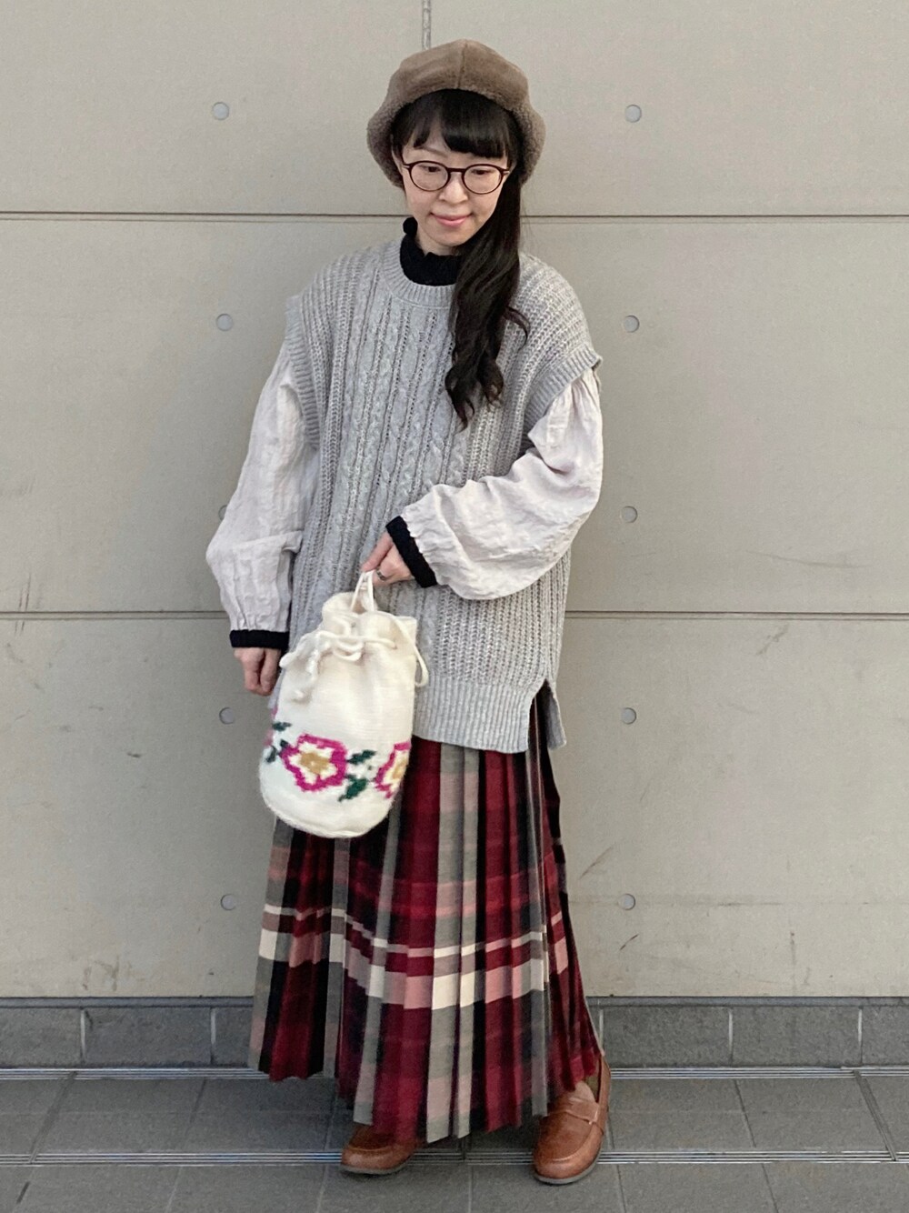 ご覧頂きありがとうございます♪ ゆったりめのニットベストは、モヘアタッチの肌触り柔らかであったかいです! ロングのプリーツスカートと合わせて、足元もあったかの冬の大人ガーリーです。