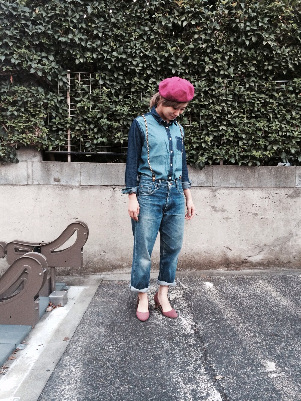 ブラック系のサスペンダーを着用したレディースの秋コーディネートの1枚目の写真
