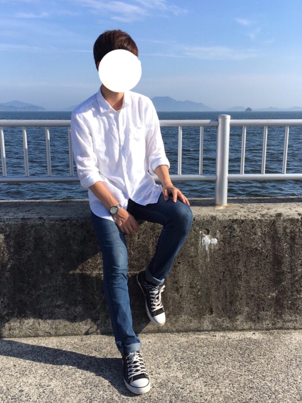 夏なので海を背景にしてみました!🏖✨ 王道の白シャツコーデにデニムを取り入れて涼しげな印象に!✨ 良かったらお気に入り、フォローよろしくお願いします!