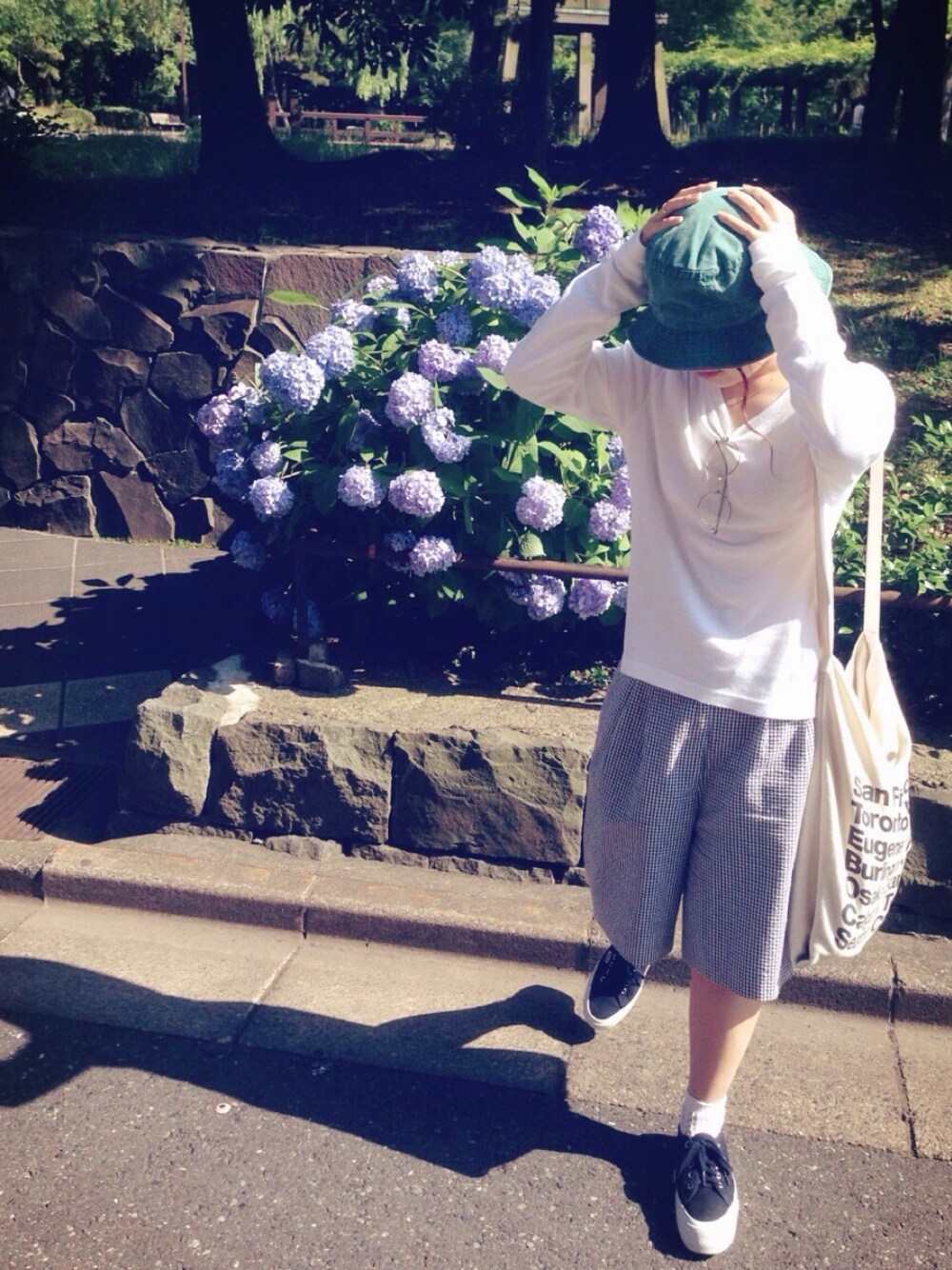 久々に天気のいい梅雨。 あじさい。おいしそう。 トップス:RalphLauren パンツ:used ハット:ADAMS くつした:tabio くつ:FILA かばん:American Apparel
