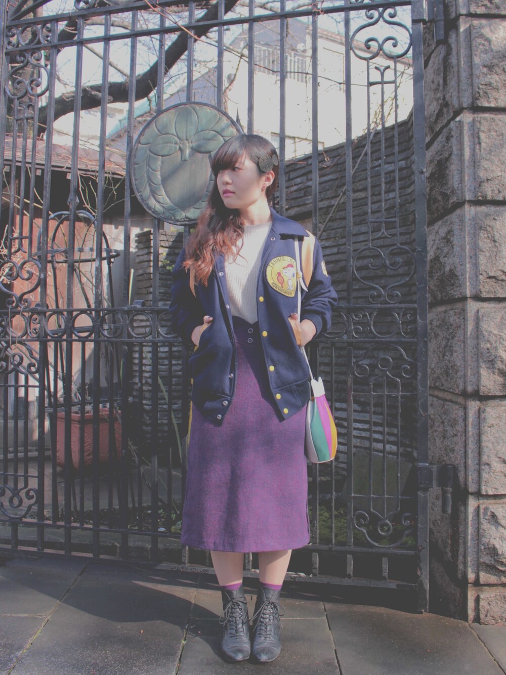 柴漬けカラー。 ニット:dholic スタジャン:used スカート:used 靴下:tabio ブーツ:used バッグ:used
