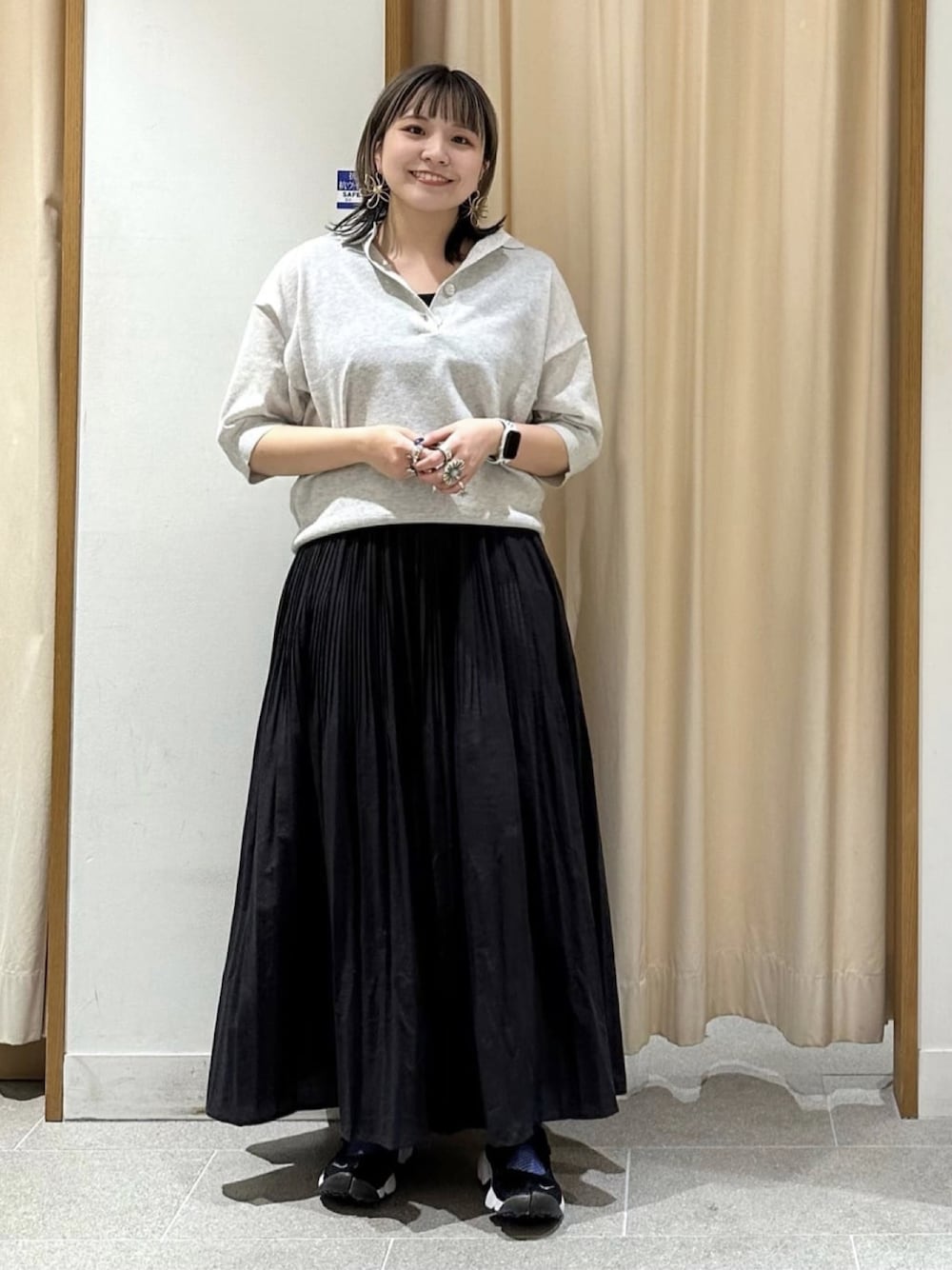 シアー素材のポロニットに 女性らしいスカートを合わせたてフェミニンなスタイリングにしてみました! ポロニットは二の腕を隠してくれる袖丈なので安心してきていただけます!