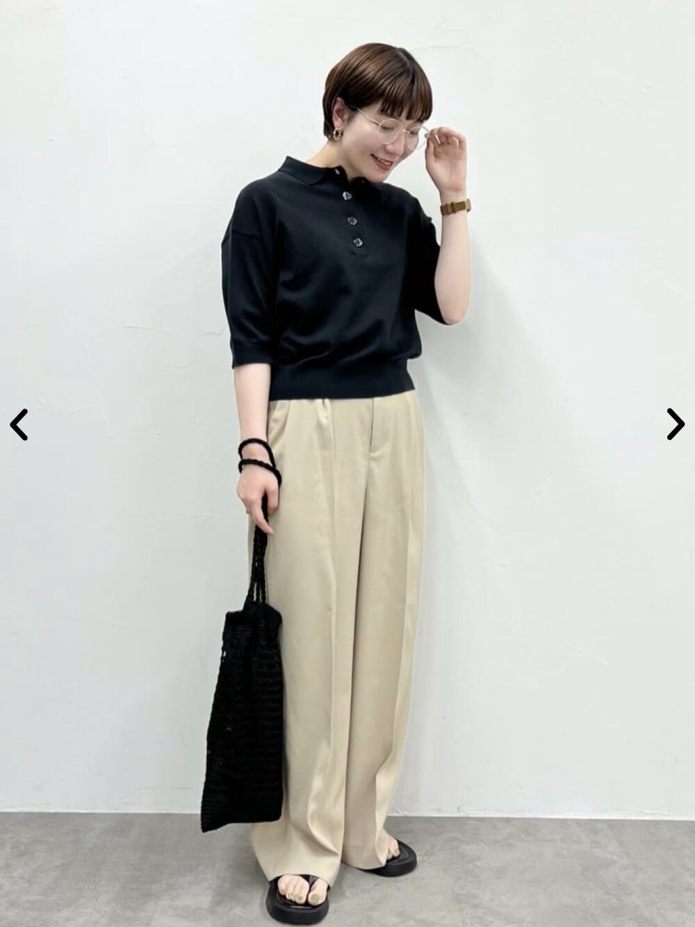 大人気のワイドスラックスパンツ。4色ともかわいいのですが、特にベージュはカジュアルでもきれいめでも着回せる優秀カラーです◎ ブラックのポロシャツと合わせて、大人カジュアルにスタイリングしました! パンツ▶︎163センチでLサイズ着用しています。ウエストはゆったりしており、着丈はかなりワイドなので、いつものサイズよりワンサイズ下げて頂くのもおすすめです◎ 腰周りをすっぽり包んでくれるハイウエストで着痩せ効果も期待できます♪