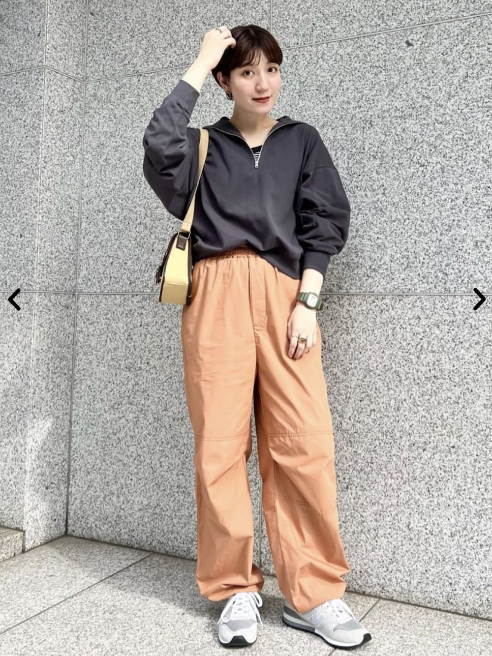 去年も大人気だったハーフジッププルオーバー。カジュアルなパラシュートパンツとの相性抜群です!ジップをさげて首元を見せることでさりげなく女性らしさをだしました◎ トップス▶︎163センチMサイズ着用。たっぷりとした身幅で、程よいクロップド丈と袖のダボッと感のバランスがかわいいです◎