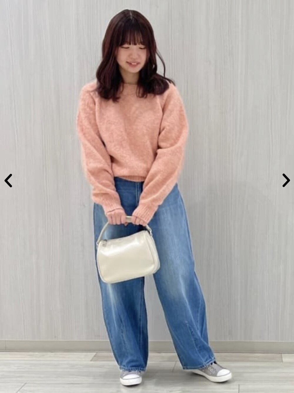 ニットは丈が短めなので、ボトムスと合わせやすいのが嬉しいです。袖のボリューム感とカラーがたまりません♡ カーブデニムパンツはゆったりシルエットですが、腰回りはスッキリしているところがポイントです。 履きやすさはもちろんですが、デザイン性があるのでシンプルめになりがちな秋冬には欠かせない一本になるはずです🐶🐾