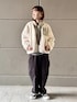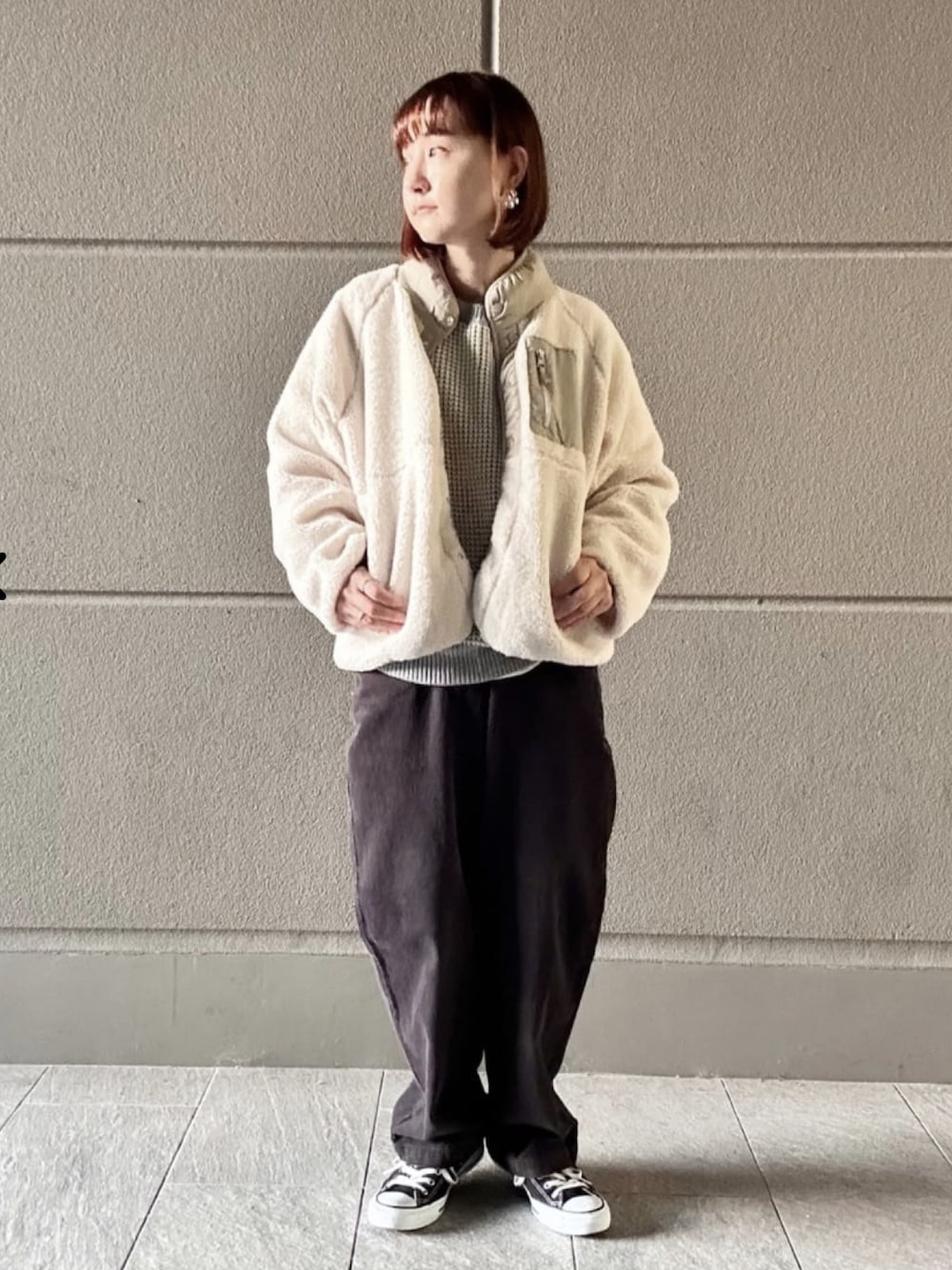 カジュアルなボアブルゾンのコーディネートです。 コンパクトなデザインでパンツでもスカートでも相性がいいです。 ワッフル編みのニットとシルエットがキレイなコーデュロイのパンツで合わせています。