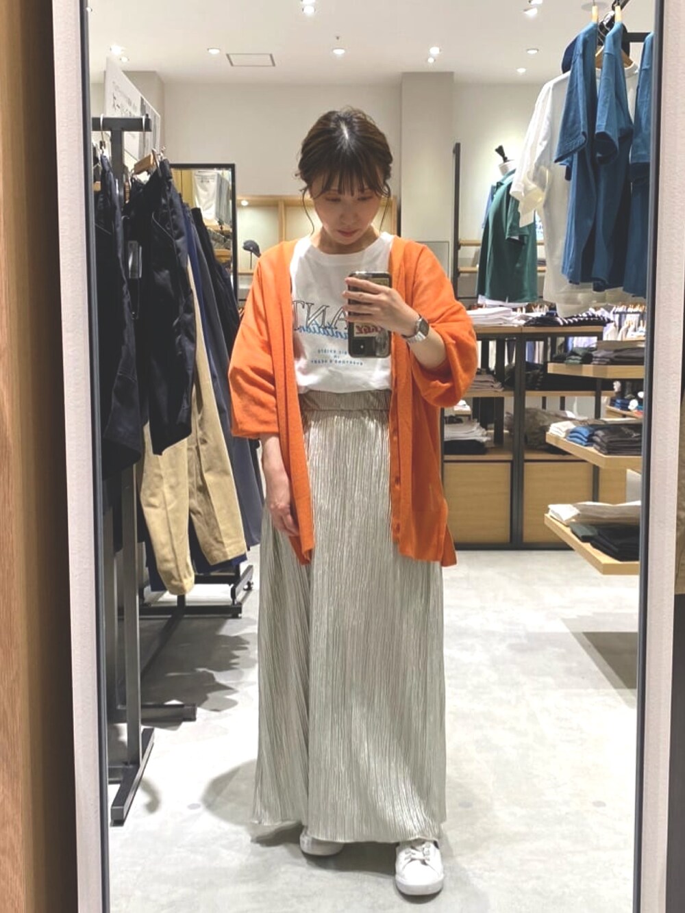 毎年人気頂いているVネックニットカーディガンを合わせたコーデです! シンプルで合わせやすく、サイドのスリットが抜け感を出してくれます。 夏はタンクトップやキャミソールの上にサラッと重ねて来て頂くのもおすすめです!