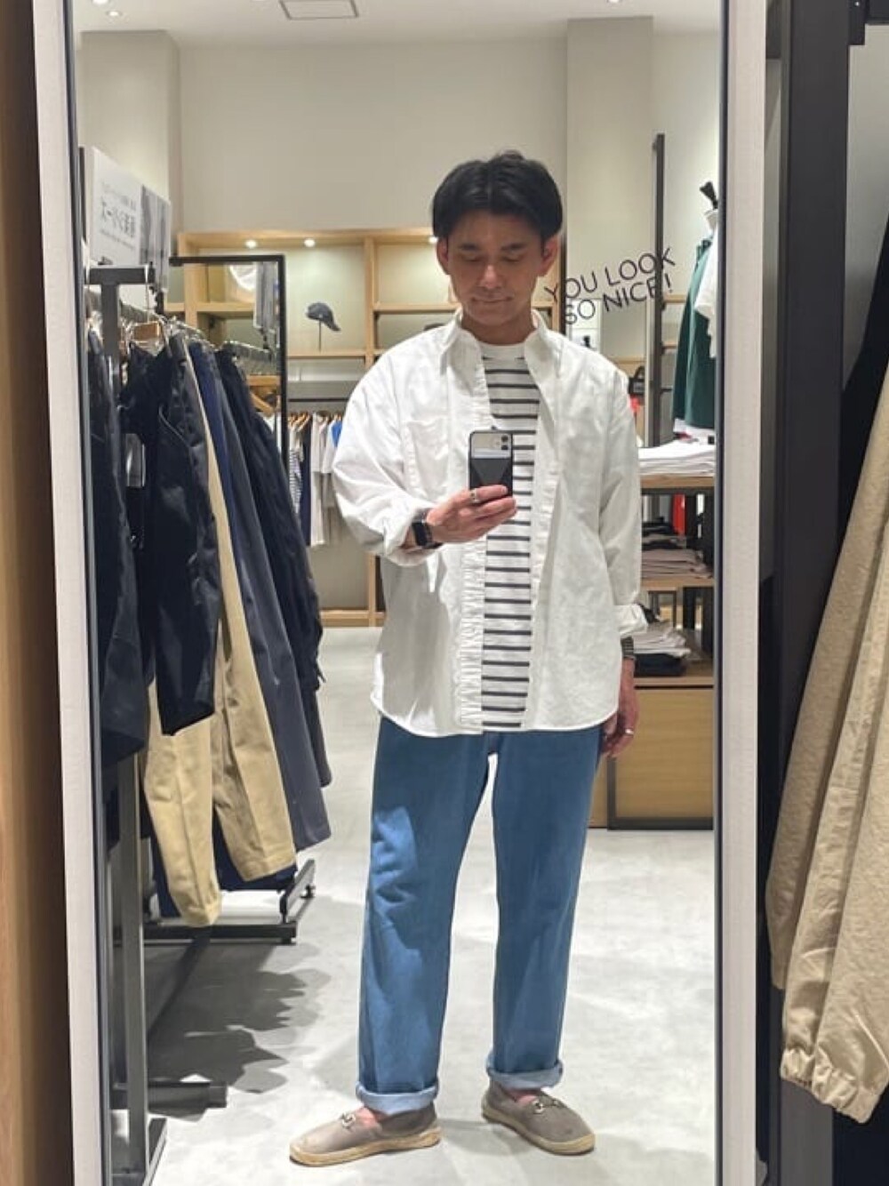 上質なリネンのシャツとデニムで シンプルコーデ。 袖、裾をロールアップし抜け感を 演出。