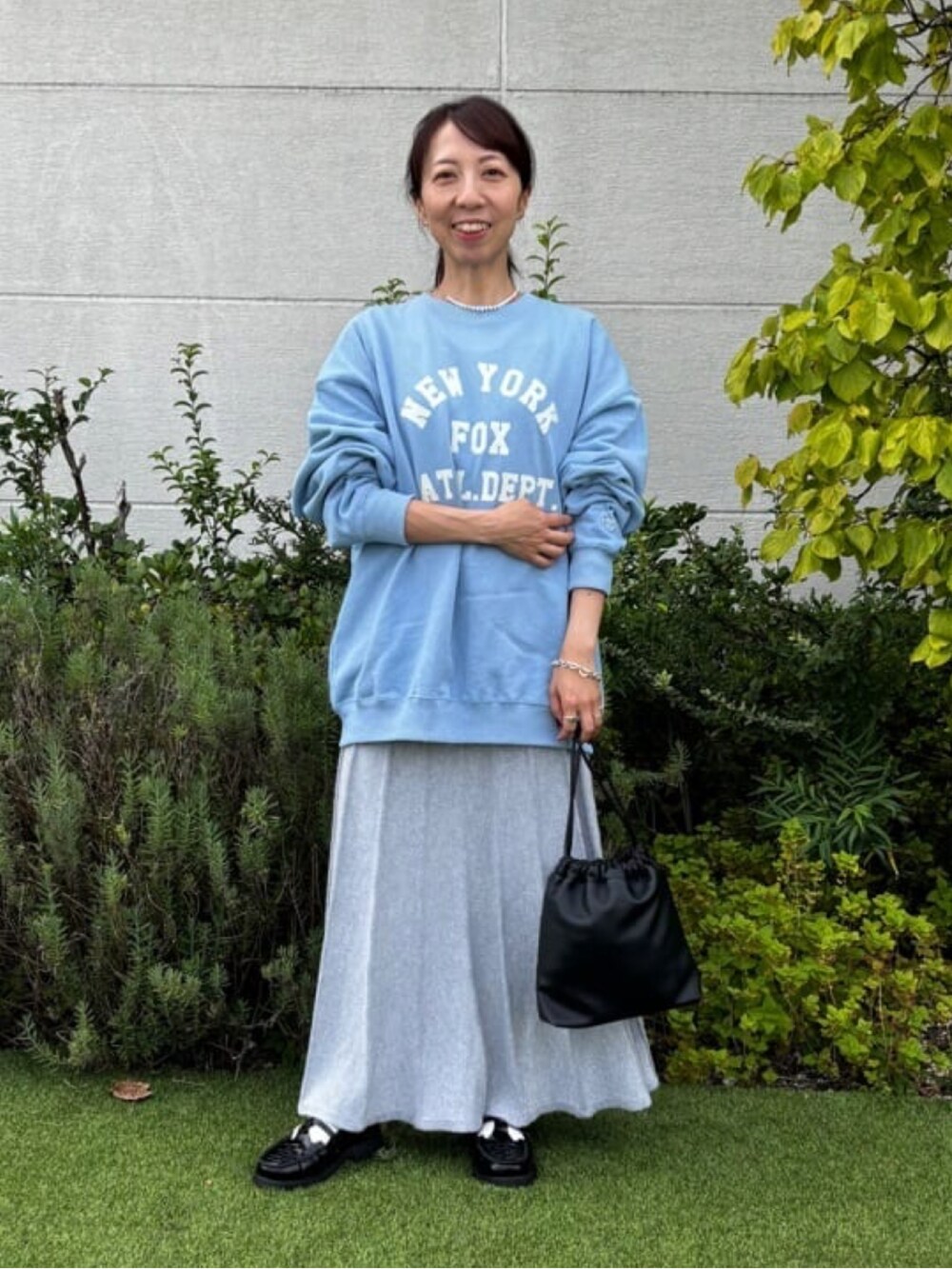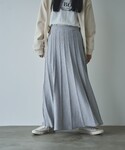 爽やかなライトブルーのスウェットをメインに、キラキラと光るラメが映えるスカートを。 スカートは、ウエストを一折りしております。 スウェットはMサイズを着用しておりますが、着丈が少し長めなので、スカートはシルエットがスッキリしたものを選びました。 秋が深まると、ダークトーンに目が行きがちですが、差し色アイテムを取り入れると、コーディネートの幅がより広がるのでぜひお試しください♪