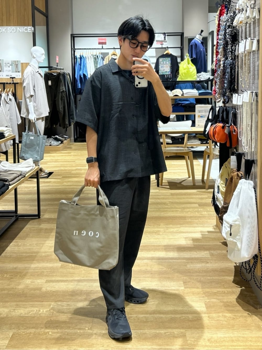 サラッとした肌あたり、リネンのような質感で選択してもシワがになりにくいのが嬉しいクリーンセットアップ!! 大人っぽい印象が出るオールブラックスタイルにトートバッグを落ち着いたベージュでアクセントにしてみました。 サイズは上下Mサイズで少し余裕のある大きめの作りとなっております。