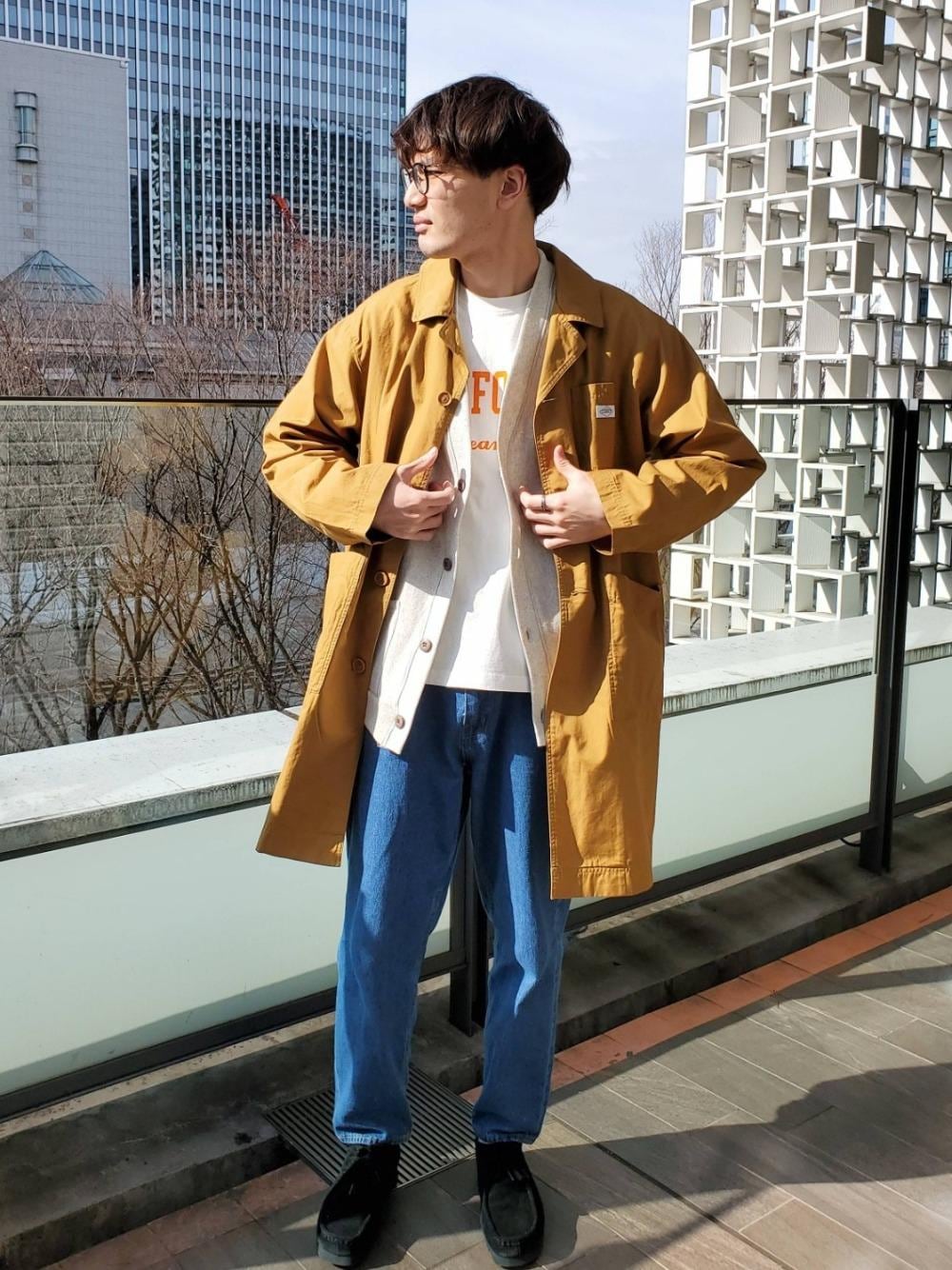コーデにデニムパンツを取り入れ、西海岸風なイメージでスタイリングしてみました。 カジュアルだけどきちんと感も少し残るショップコートは何となく羽織るだけで様になりやすい便利アイテムです。 大人の男性であればシューズはスリッポンもカッコイイですが、まだまだ未熟な私はレザーシューズで引き締めてバランスを取っています。 商品名:C.H.Wショップコート サイズ感:XL着用。 身幅はありますが、着丈は短めでバランスが取りやすいです。 素材感:綿100%です。少し残るシワ感がワークなデザインと相まって渋い雰囲気を醸しています。