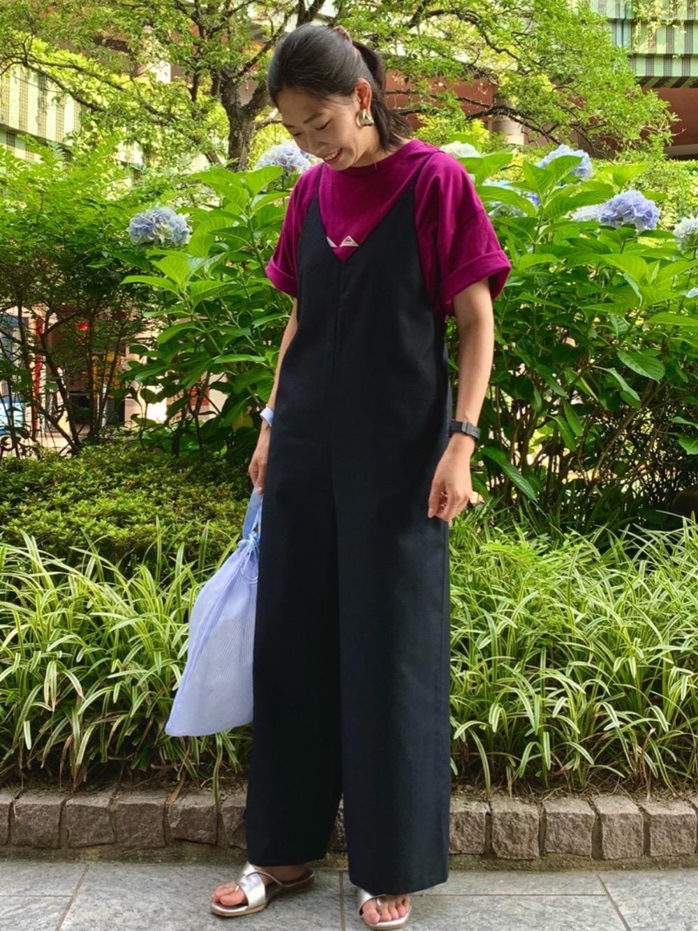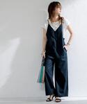 使いやすい黒のサロペットに夏らしく明るいTシャツで合わせました。 商品名: 【2セットアイテム】Tシャツ×キャミサロペット サイズ感:丈が長めですが後ろの紐で長さが調節できます。ビックTを合わせてもお腹回りがもたつかない大きさです。 素材感:サロペットはサラッとしていて薄すぎず夏は快適に過ごせる生地です。付属の白のインナーのTシャツは少し透け感がありました。