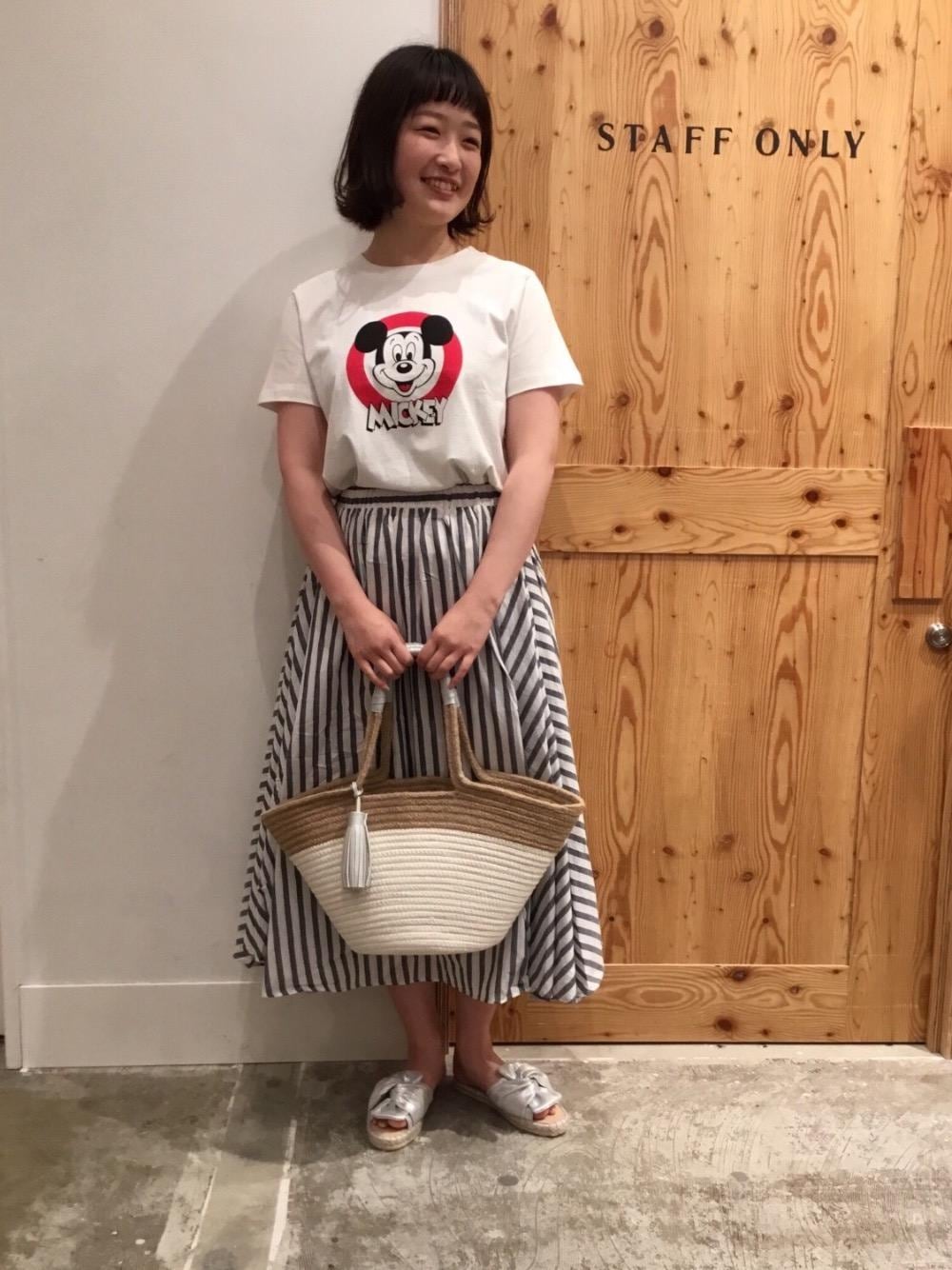 みんな大好きミッキー! キャラクターTシャツは スカートと合わせてカジュアルさをだしすぎないのがポイントです!
