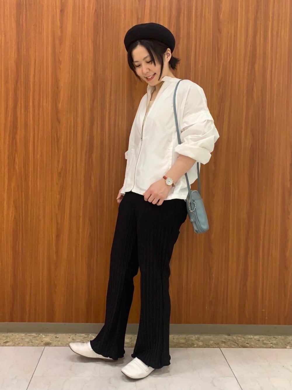 トレンドのプリーツパンツを大人カジュアルにコーディネートしました。フレアラインで脚やせ・脚長効果有り! 商品名:スムースカットプリーツパンツ サイズ感:163cm、Mサイズ着用、足首まですっぽり隠れます。ウエストがゴムで股上深めなので折り返すことで少しだけ長さが調節できます。 素材感:レーヨンが入っているので落ち感と少しの光沢感があります。ストレッチも効いていておうち時間にもピッタリです。