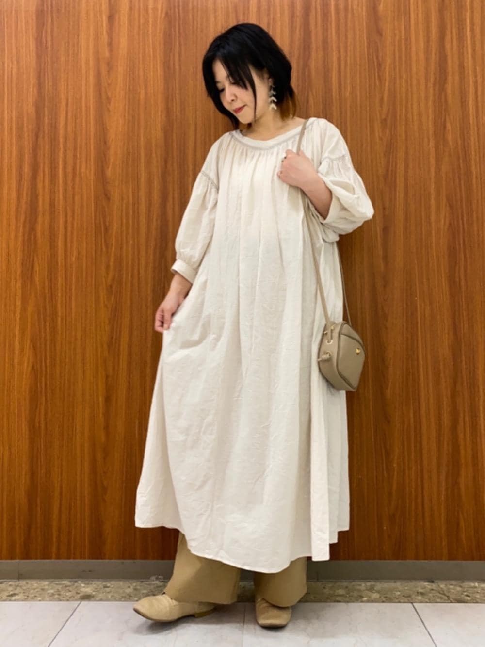 ふんわりシルエットなこれからの時期活躍するドライタッチなマキシ丈ワンピースです。 商品名:ヨクバリネン・マキシ丈ギャザーワンピース# サイズ感:フリーサイズ。163cmでくるぶし上位の丈感です。小柄な方はウエストにベルトを巻いて調節するのがオススメです! 素材感:透け感有り。薄手ですがハリがあり、ギャザーによるボリュームもあります。綿麻なので汗ばむ時期にもサラリと着こなせます!裏地がないため重ね着がオススメです。ベージュやモカなどが目立たず合わせられます。