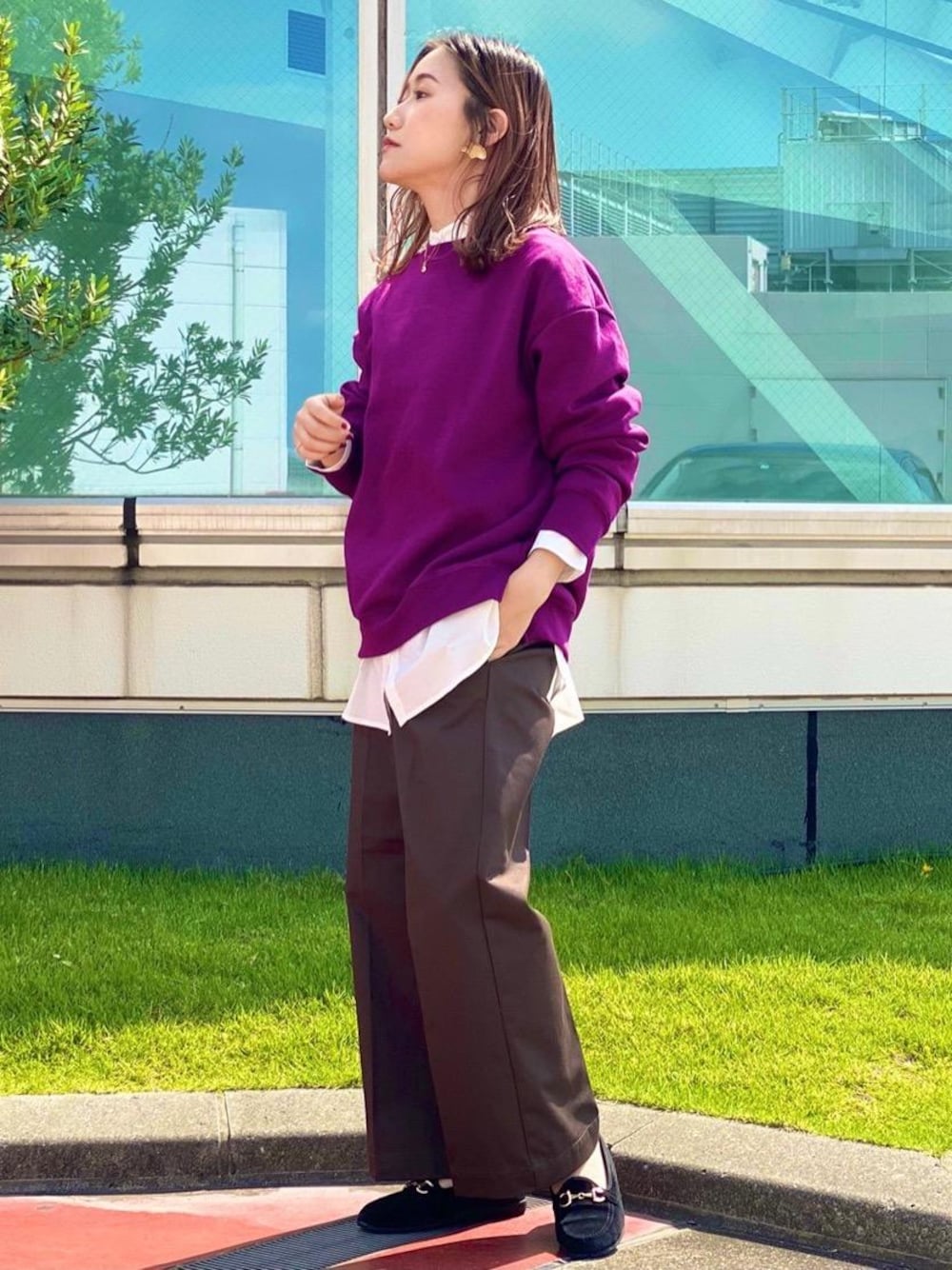 鮮やかな紫のmen'sトップスを ラフになりすぎないように シャツでレイヤードにしました! 紫とブラウンの色合わせが 周りと差がつくのでオススメです! 商品名:ダンボールリラックスクルーネックプルオーバー サイズ感:メンズSサイズでもゆったり 素材感:キメの細かい滑らかな素材。 生地は柔らかいですがしっかりしてます。