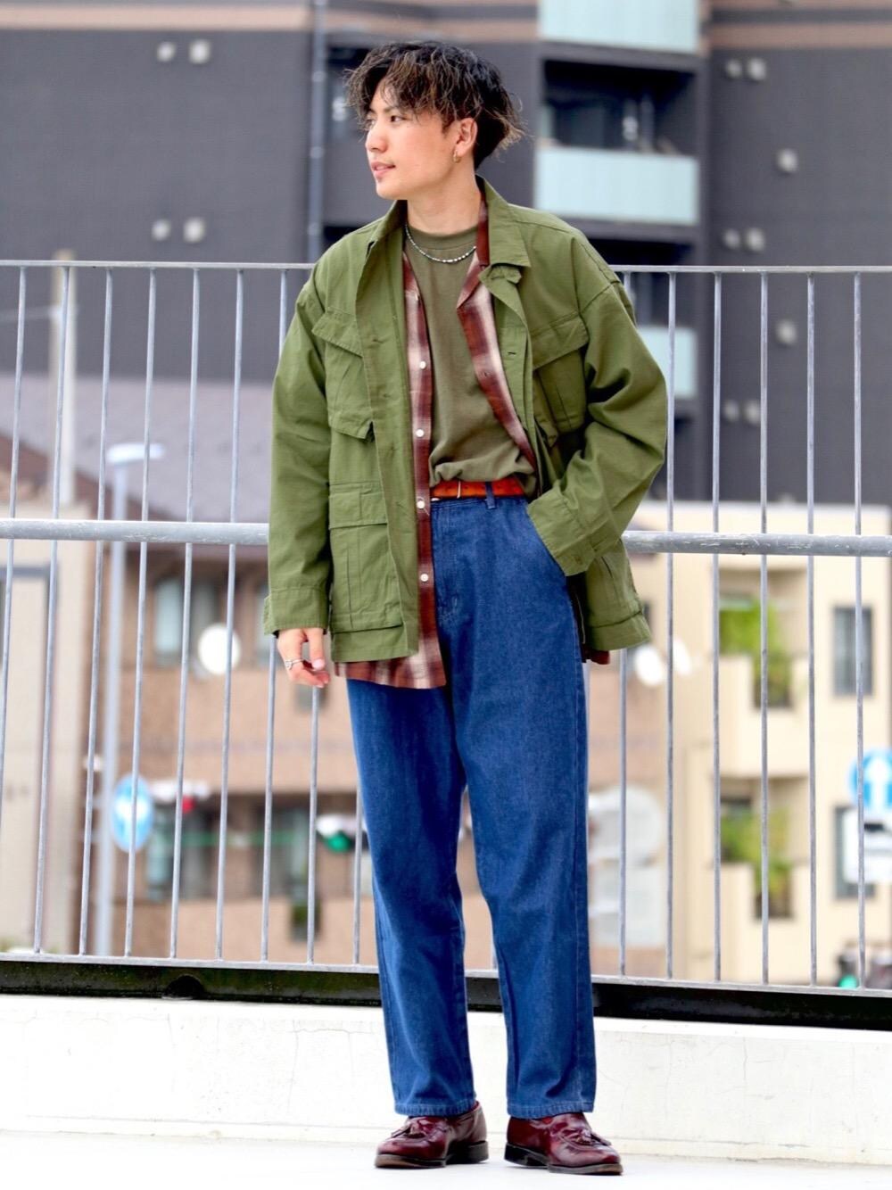 チェックシャツとシューズのチョイスがポイントです。 ●商品名 リップストップBDUジャケット サイズ感: Lサイズ着用。ゆとりのあるサイズ感。 素材感: 程良い厚みのあるリップストップ地。
