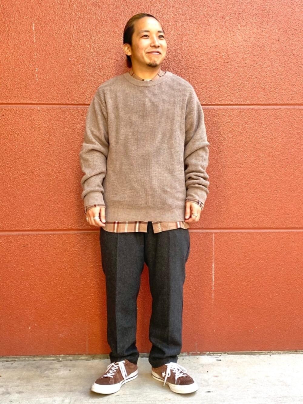 カットソーと靴を同系色でまとめました。 最近は気温が高いですがニットは薄手なのでレイヤードもしやすいです☆スニーカーから革靴に変えればきれいめテイストになりデートもばっちりです!