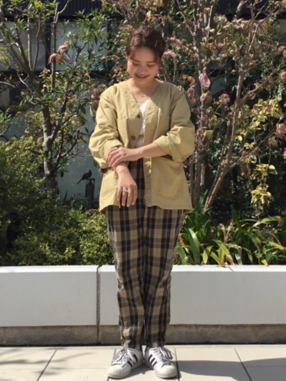 ベージュのワントーンコーデです。 春らしいジャケットを着用してみました。 カジュアルすぎないようにタンクトップで女性らしさプラスしてます。
