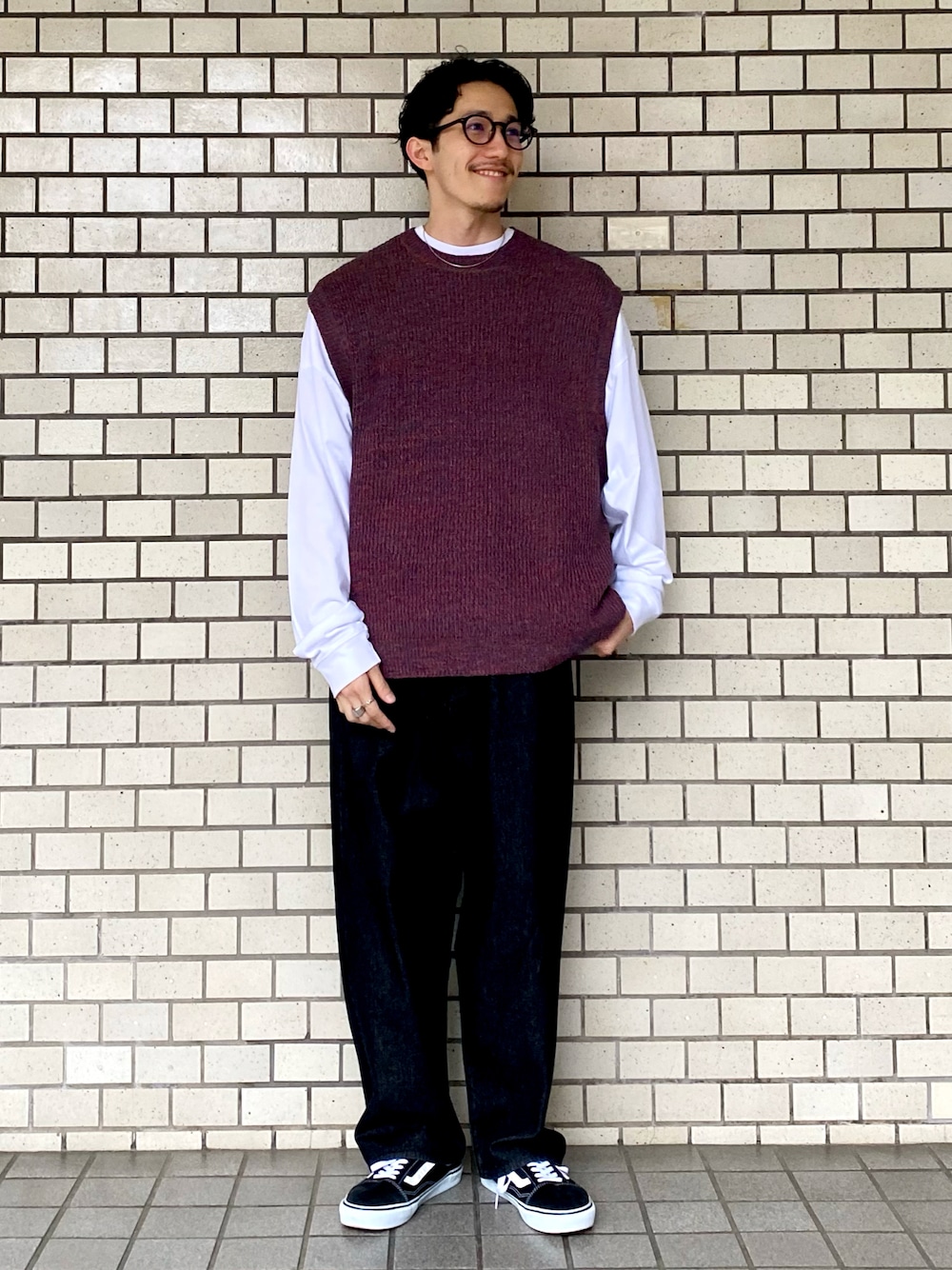 23FWの新作アイテムです。 今季注目のミックスカラーのニットベストを主役にしたコーデ。 デニム+ロンTEEで合わせせてキメすぎず、清潔感のあるシンプルスタイルです。