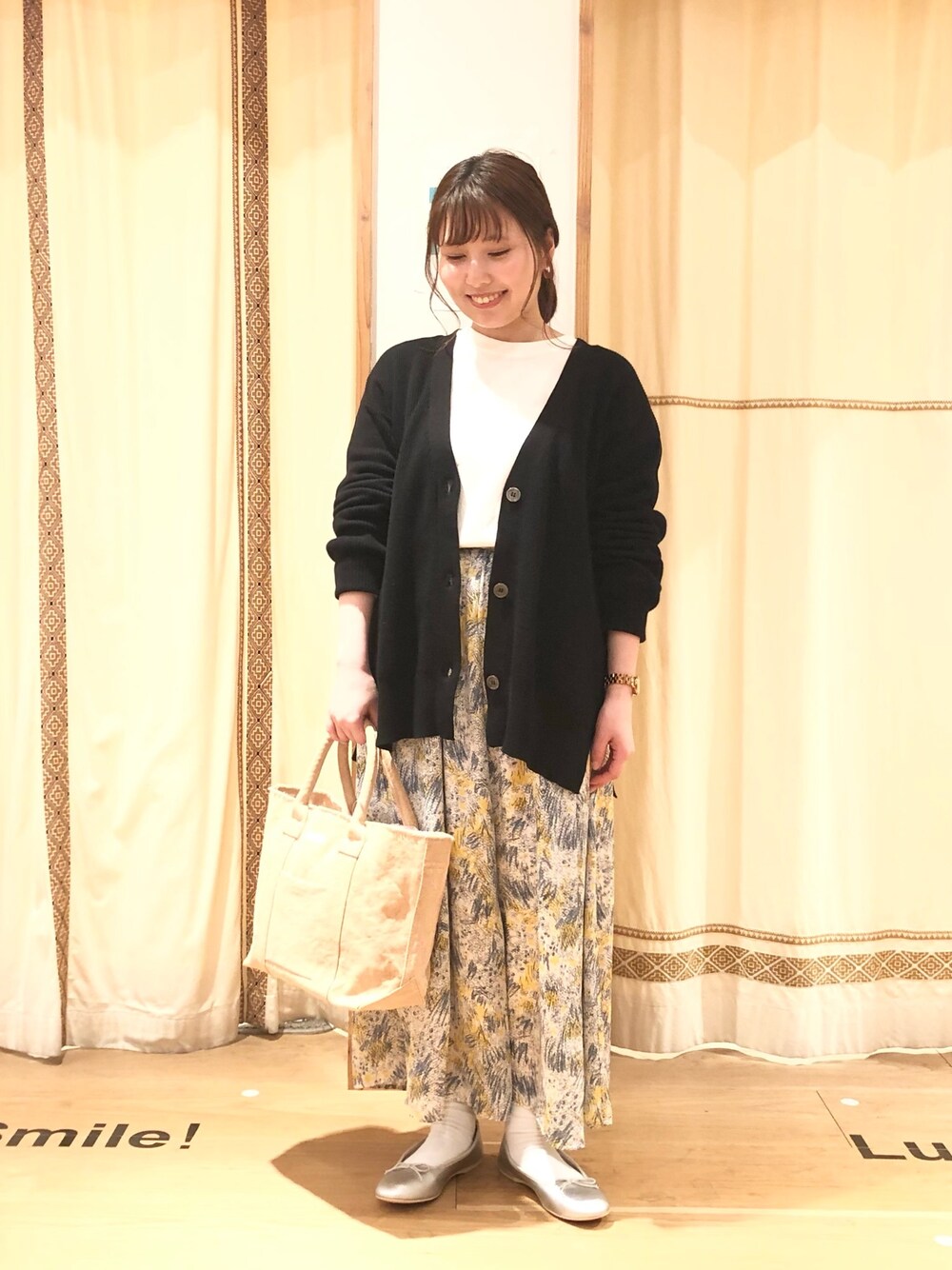 ボトムスは春らしいフラワー柄スカートでも、トップスカーディガンはブラックで大人っぽい配色にしました🐸 スカートはひとまくりして、上げています!